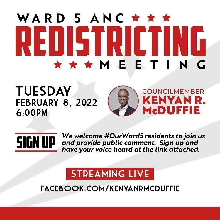 Residents are invited to provide comments to the Ward 5 ANC Redistricting Task Force. Comments may be provided live in an online public meeting on Tuesday, February 8, 2022, at 6:00 pm. Written comments will also be accepted until Tuesday, February 22, 2022.