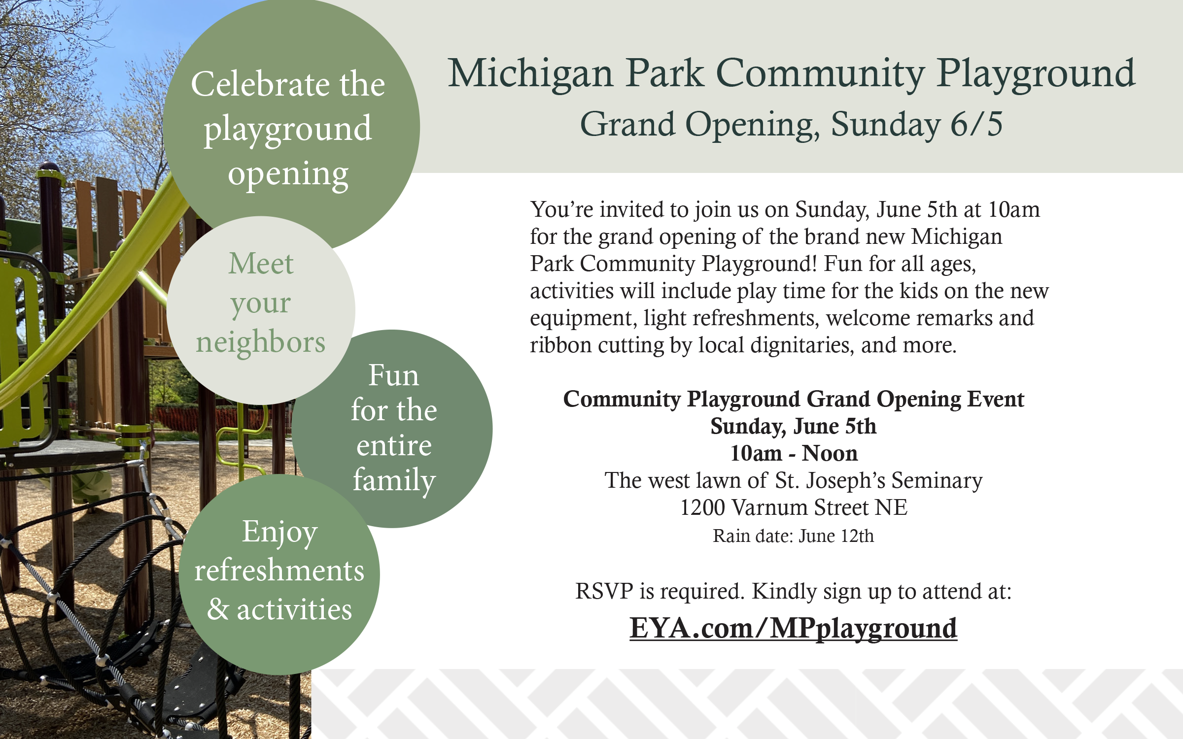 Michigan Park Community Playground Opening Event June 5, 2022 10:00 am-12:00 West lawn of St. Joseph’s Seminary 1200 Varnum Street NE RSVP at EYA.com/MPplayground