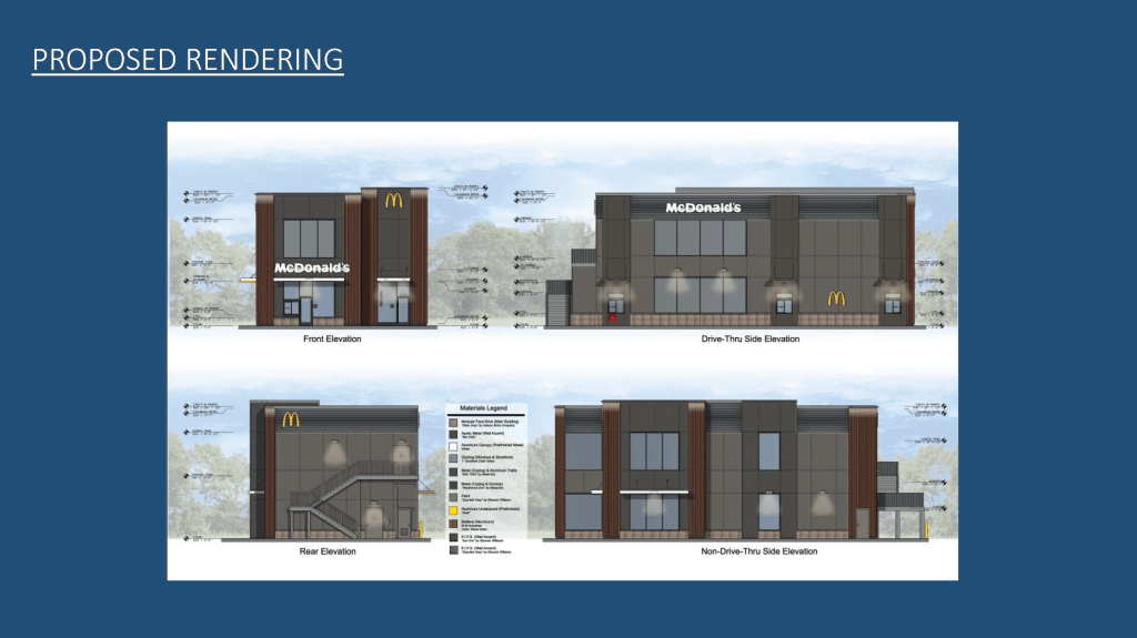 McDonald’s presentation from the May meeting, which includes a simple rendering, and other documents related to the request are available on the ANC’s website under Documents→Presentations→2022→May 2022→McDonalds. Edited to add: They will replace the renderings that are currently in the restaurant. At the meeting, the owner said the plan is to have the kitchen on the second floor; there would not be any seating on the second floor. This would allow them to have a building with a smaller footprint. He said that currently, the food is cooked in the basement of the restaurant and brought up to the first floor. Also, counsel stated that the District Department of Transportation (DDOT) has asked McDonald’s to perform a queue analysis. In keeping with what they previously planned, they said they plan to remove the curb cut on South Dakota closest to Delafield Street.