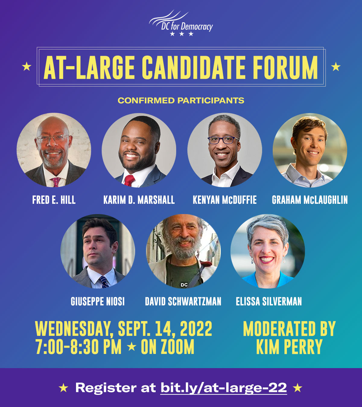 Next week on September 14, 2022, DC for Democracy will be holding a candidate forum moderated by Kim Perry. Register and send questions in advance at bit.ly/at-large-22.