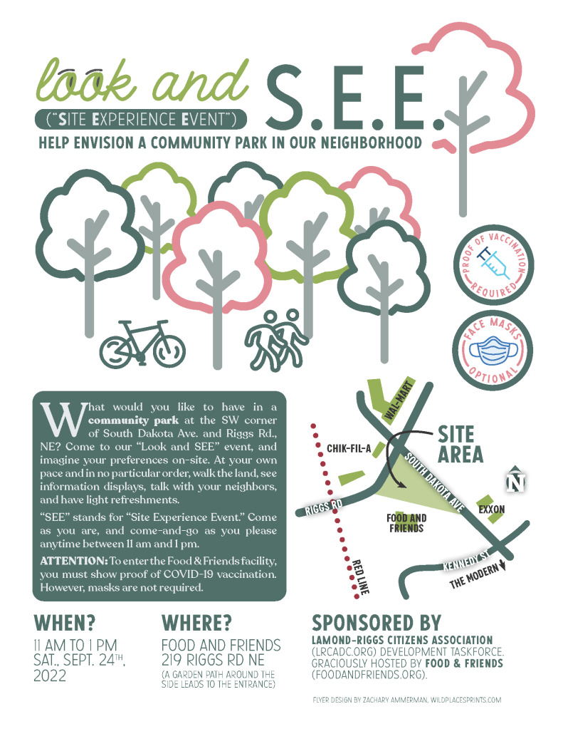 The Lamond-Riggs Citizens Association (LRCA) held a Look & SEE regarding the District-owned green space on the southwest corner of South Dakota Avenue & Riggs Road NE near Food & Friends (shout out to resident/co-chair of LRCA development task force Deborah Grimstead for the concept). If you were not able to attend, you can still give your input on how you would like to see this green space preserved and maintained for community use.