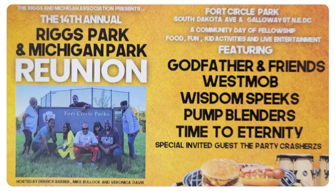 The annual Riggs Park & Michigan Park Reunion event will take place this Saturday, September 10, 2022, from 12:00 pm to 7:00 pm at Fort Circle Park (South Dakota Avenue NE & Galloway Street NE).