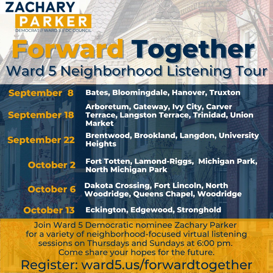 Zachary Parker won the Democratic nomination to represent Ward 5 on the DC Council. Ahead of the general election in November, he is holding a Ward 5 neighborhood listening tour. On October 2, 2022, at 6:00 pm, he will hold a virtual listening session for neighbors in the Fort Totten, Lamond-Riggs, Michigan Park, and North Michigan Park neighborhoods.