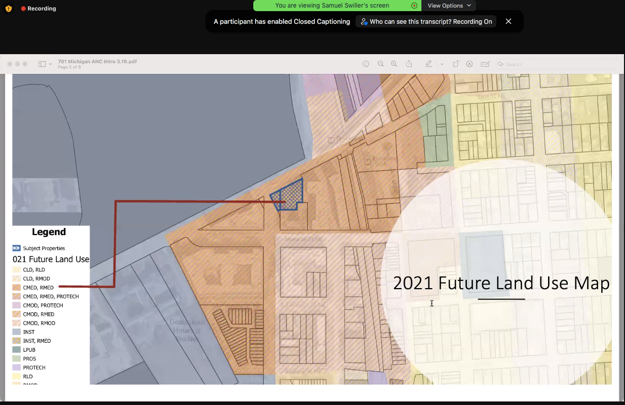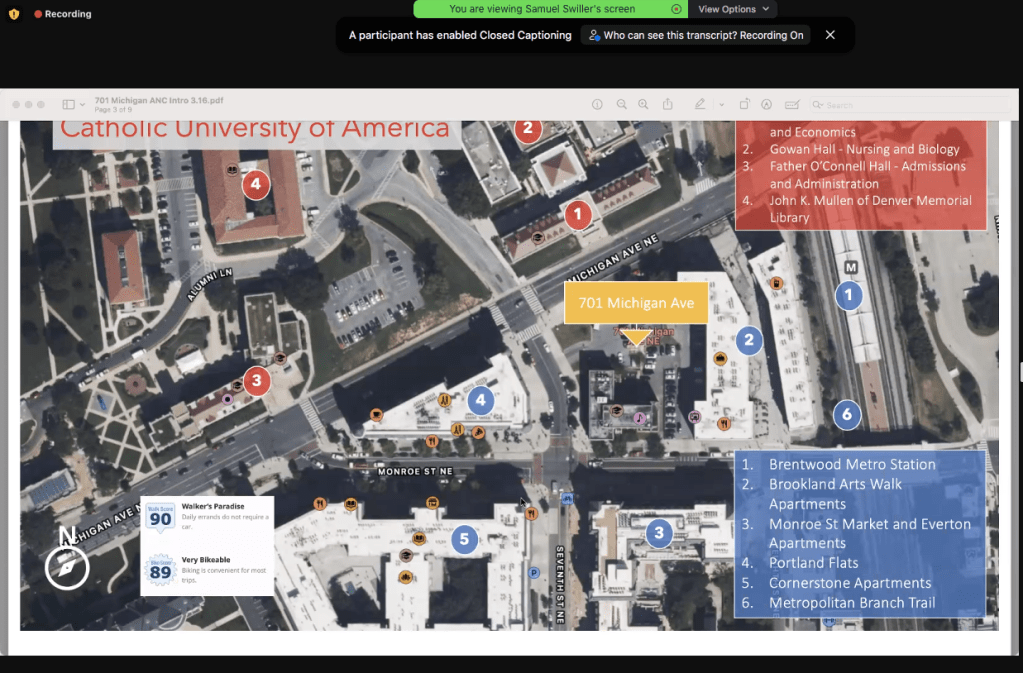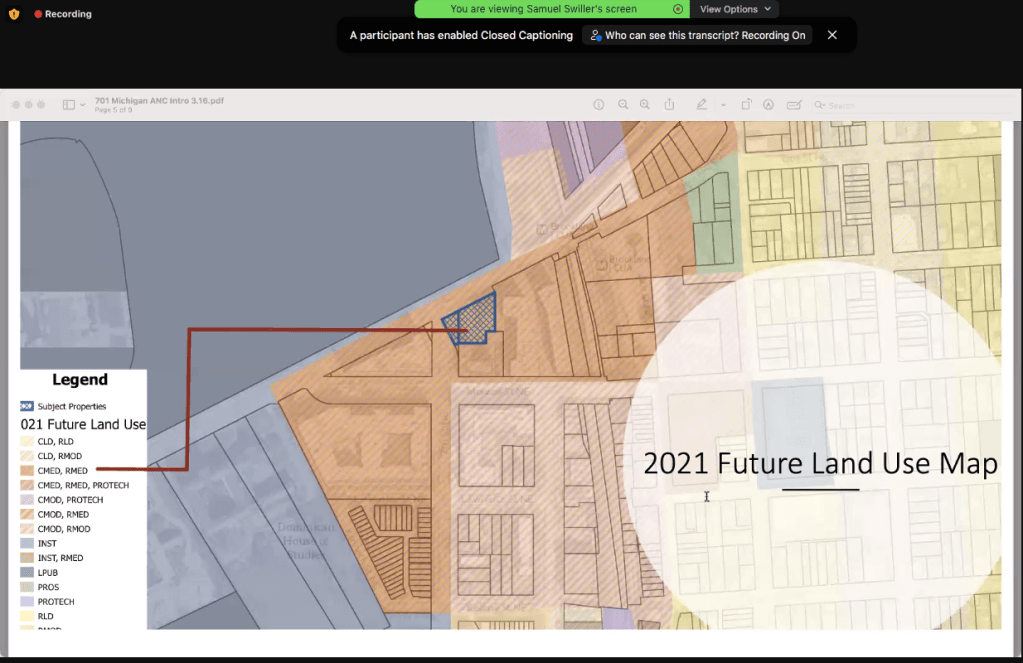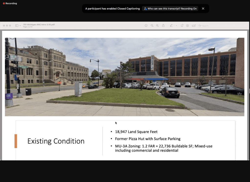 A development team wants to change the zoning district of 701 Michigan Avenue NE from MU-3A to MU-2. They said they are pursuing the map amendment to reflect a change to the Future Land Use Map (FLUM) from moderate to medium density so that a planned unit development (PUD) would not be necessary for an anticipated development. They said they do not have any particular development plan in mind yet, but they will get feedback from residents about what sort of permitted uses within the MU-2 zone would be desirable. They will take advantage of the property’s proximity to the Brookland Metro station.