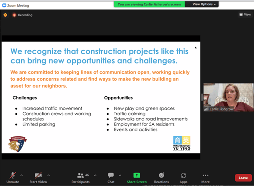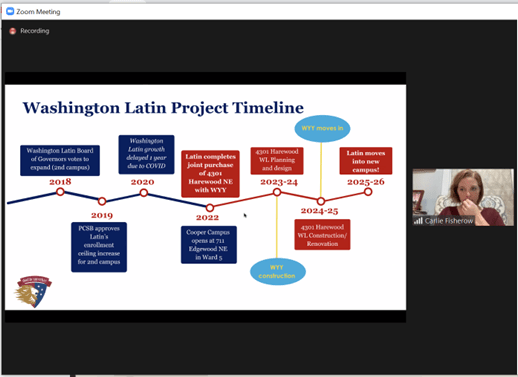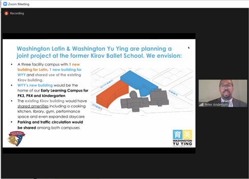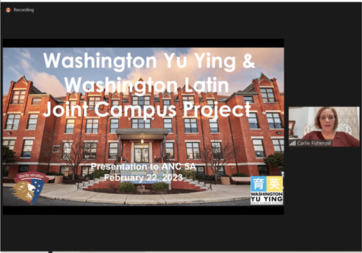 Washington Yu Ying Public Charter School and Washington Latin Public Charter School are teaming up for a joint campus project at the former Kirov Academy of Ballet school building located at 4301 Harewood Road NE. This project sits in ANC 5A05, which is currently without a commissioner. School officials are working with the Pleasant Hill Civic Association. This was just the first vist by school officials to ANC 5A. They plan to continue engaging ANC 5A.