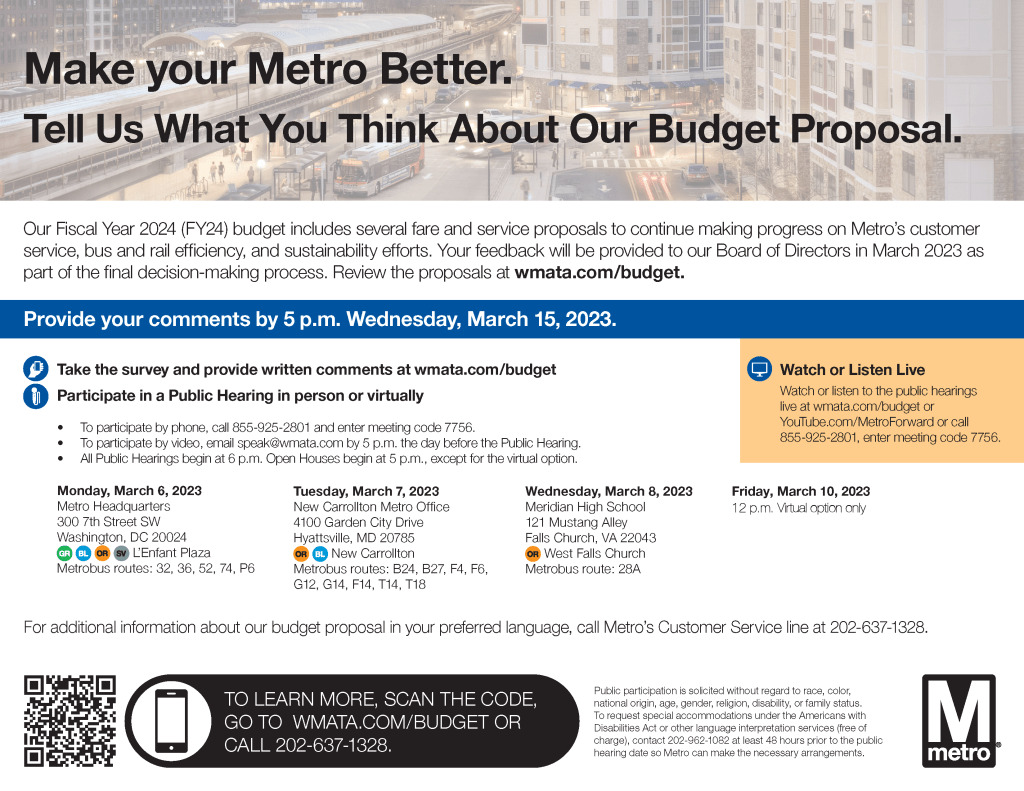 Metro is soliciting public input on its proposed FY24 budget. View details at wmata.com/budget. Provide input by completing a survey or by participating in an upcoming public hearing.