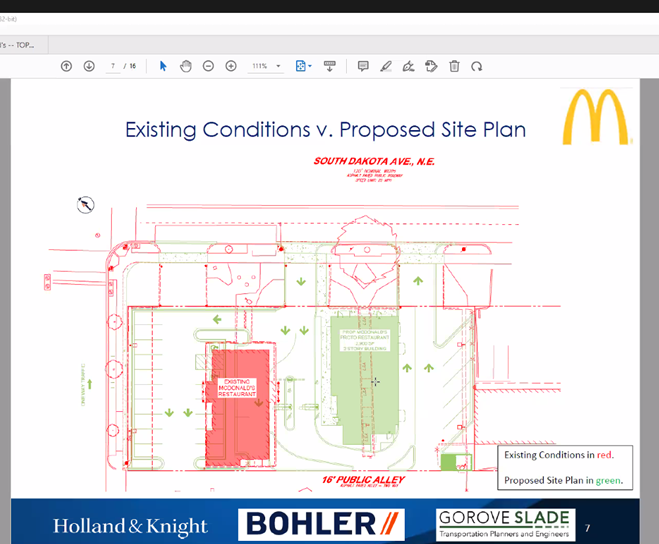 Following a change to the Future Land Use Map (FLUM) in the Comp Plan Update, a separate Zoning Commission process resulted in a map amendment (rezoning) of the McDonald’s property that permits rebuilding the restaurant with a drive-thru as a matter of right. The restaurant does not currently have a drive-thru. Part of the public space permit application involves where McDonald’s will be able to have curb cuts for the drive-thru.