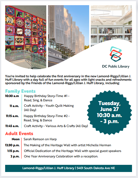 The Lamond-Riggs/Lillian J. Huff Library celebrated its one-year anniversary on Tuesday, June 27, 2023. The day began with a Happy Birthday Story Time at 10:30 a.m. and again at 11:15 a.m led by children’s librarian Jesse Williamson. After story time, the children cut squares for a paper quilt in celebration of the one-year anniversary.