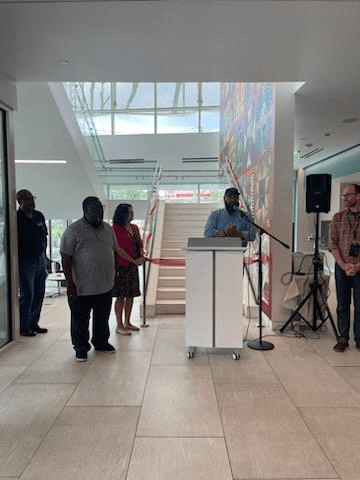 Next, the Heritage Wall Dedication Ceremony began at 12:30 p.m. Artist Michelle Lisa Herman held an artist talk about the journey from conception to completion of her work creating the Heritage Wall. Michelle explained the features of her art via examples from earlier commissions. She created an interactive piece using live monitors that captured and displayed the viewer’s reactions to the piece, for example.