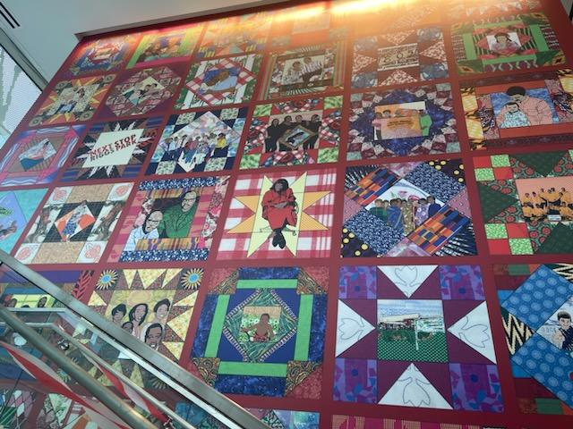 DC Public Library commissioned Ms. Herman to express “community,” which was the popular reply by patrons when asked to give a one-word response best describing their neighborhood. Her response was a digital quilt. Each square features a picture and a memento such as a cloth, fabric, or embroidery, contributed by community members. Each square stitched together forms the digital quilt.