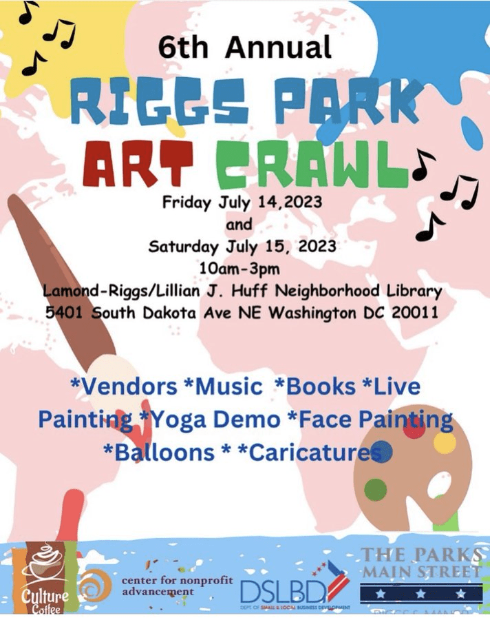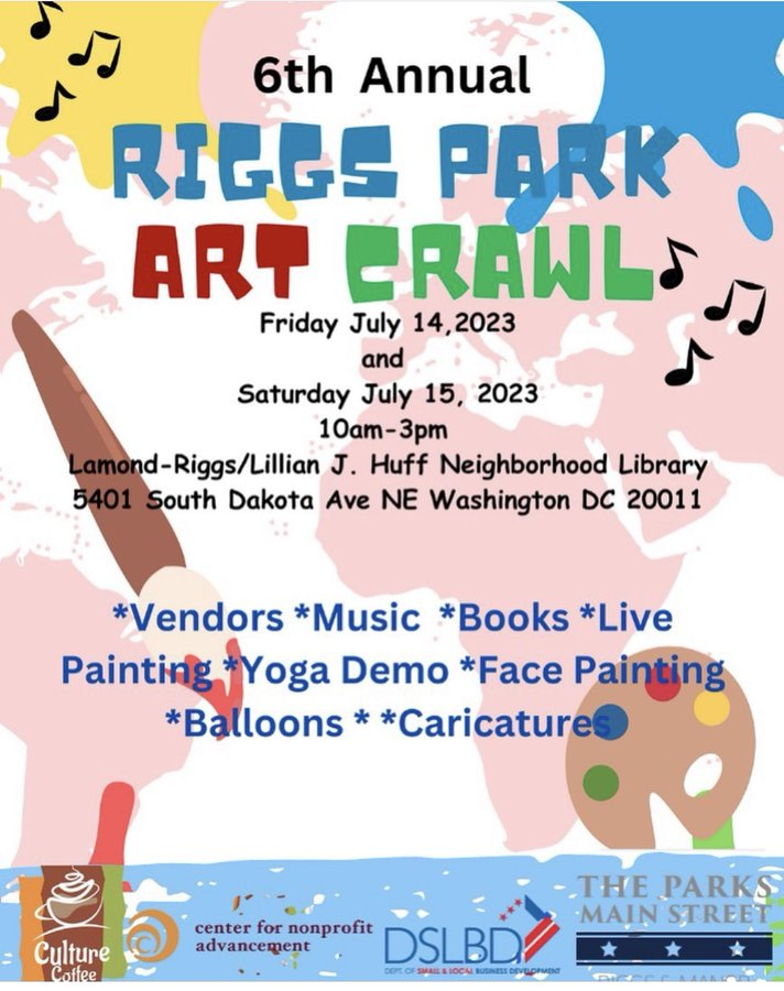 Sixth Annual Riggs Park Art Crawl July 14 & 15, 2023 10:00 am-3:00 pm Lamond-Riggs/Lillian J. Huff Neighborhood Library 5401 South Dakota Avenue NE