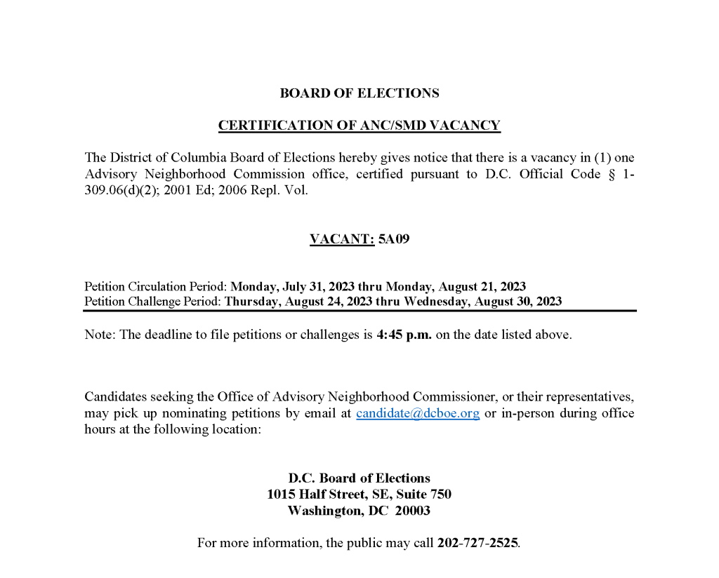 The seat for ANC 5A09 is now vacant. Interested candidates may pick up petitions starting today July 31 through August 21, 2023.