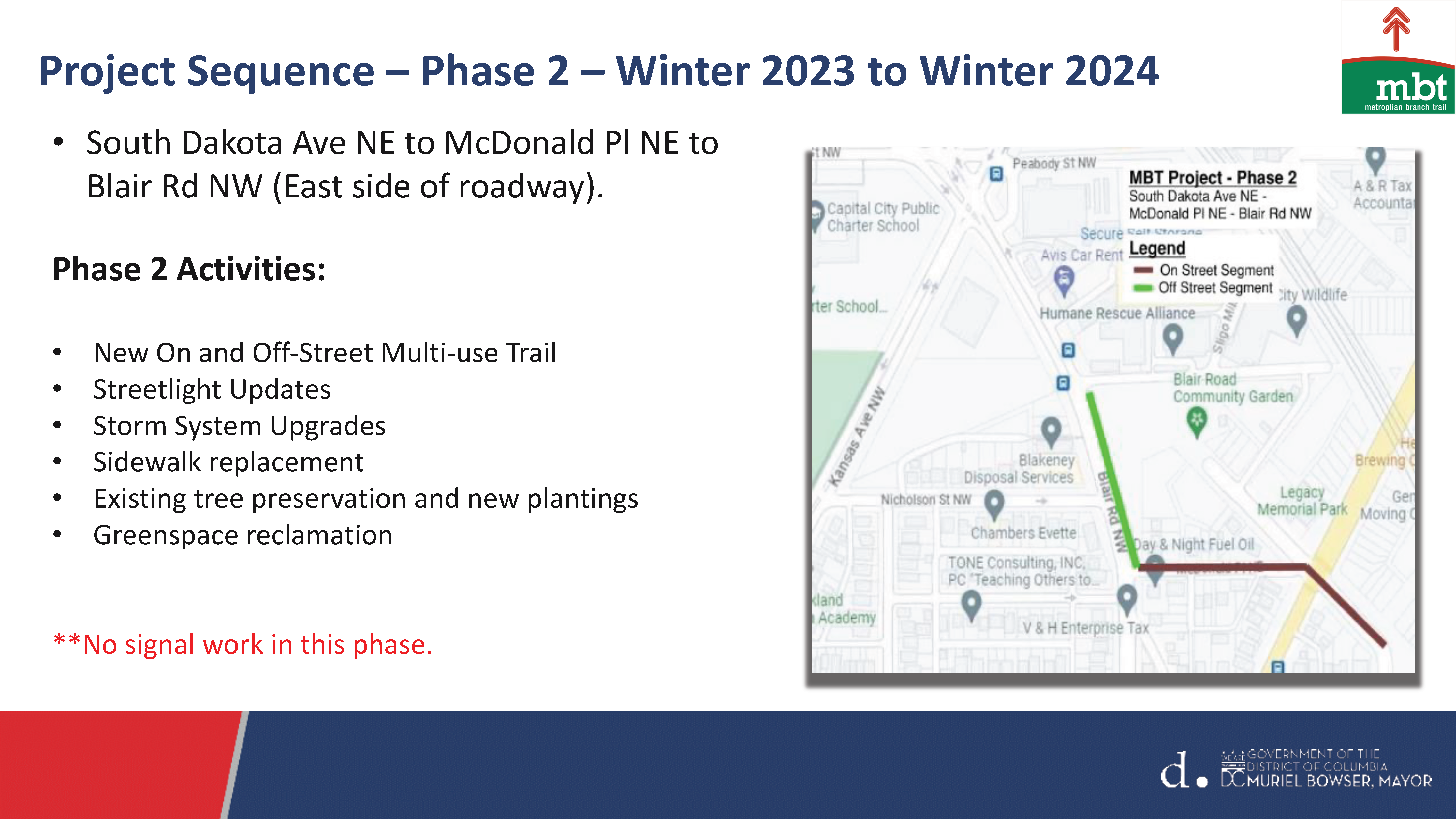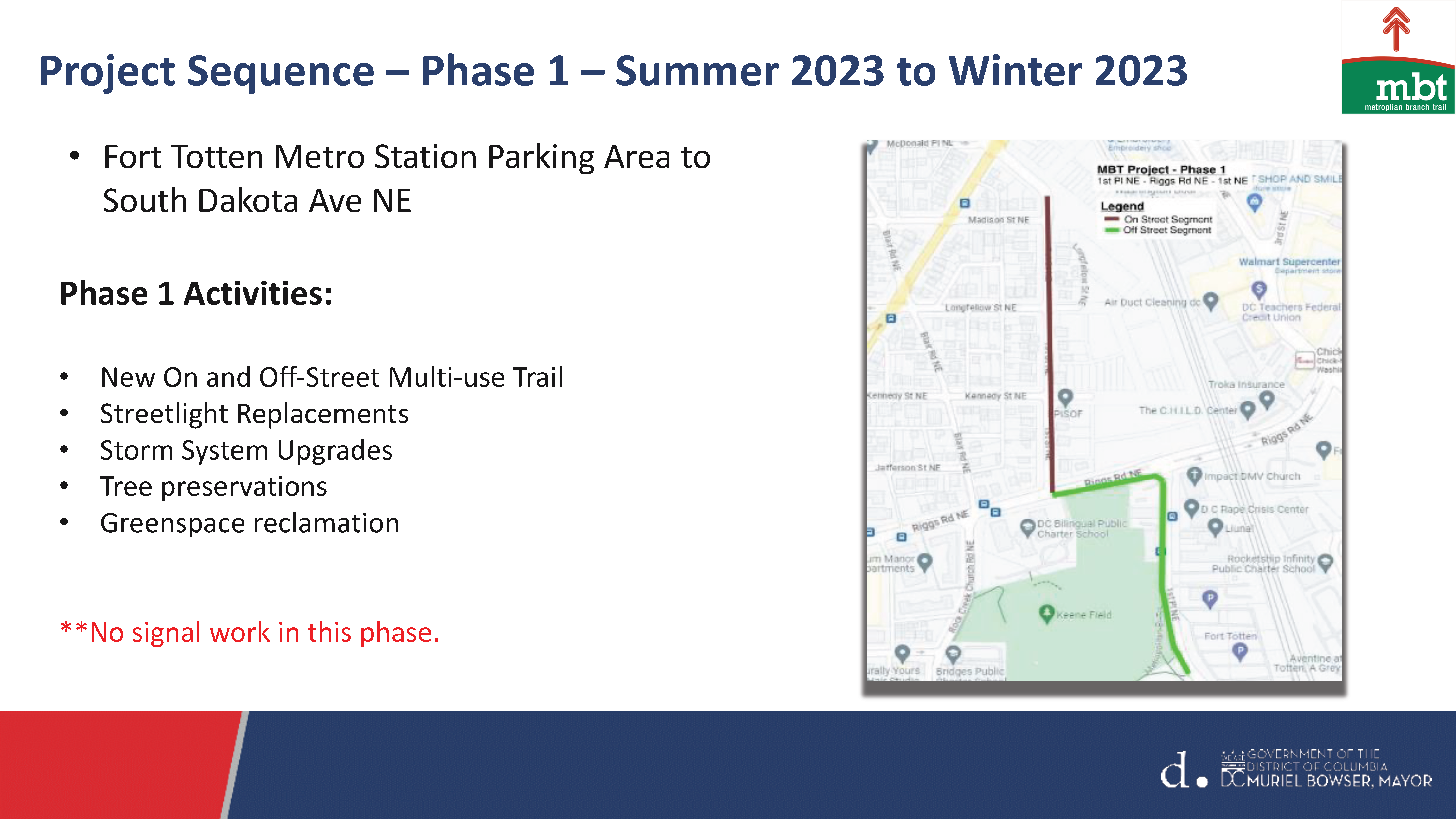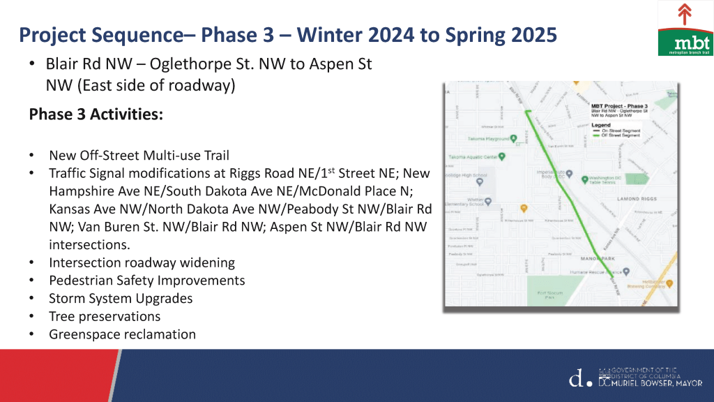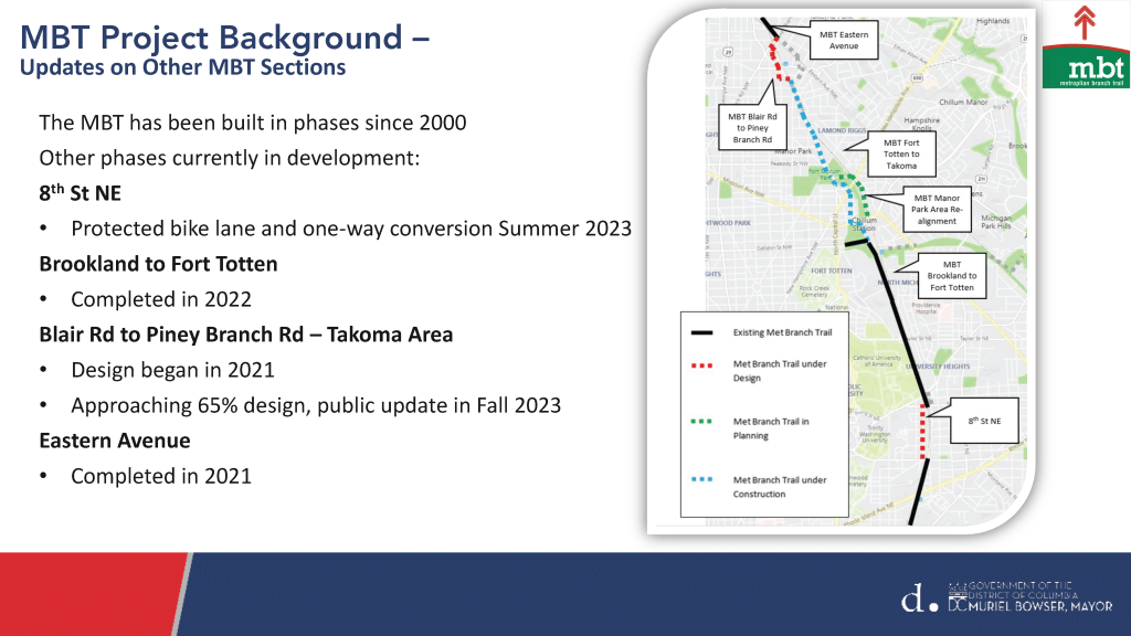 On July 18, 2023, the District Department of Transportation (DDOT) held a pre-construction meeting on the extension of the Metropolitan Branch Trail (MBT) from Fort Totten to Takoma. The dedicated project website is https://mbt-forttotten-takoma.ddot.dc.gov. There you can find construction updates and project resources such as design plans and meeting presentations. Construction will take place in phases. Completion is expected in 2025. Send questions/concerns to project email at metbranchtrail@dc.gov.