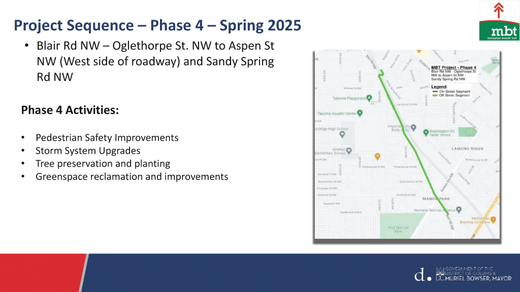 Phase 4: Spring 2025 to Summer 2025 Construction on Blair Road NW – Oglethorpe Street NW to Aspen Street NW Construction on West side of roadway and Sandy Spring Road NW