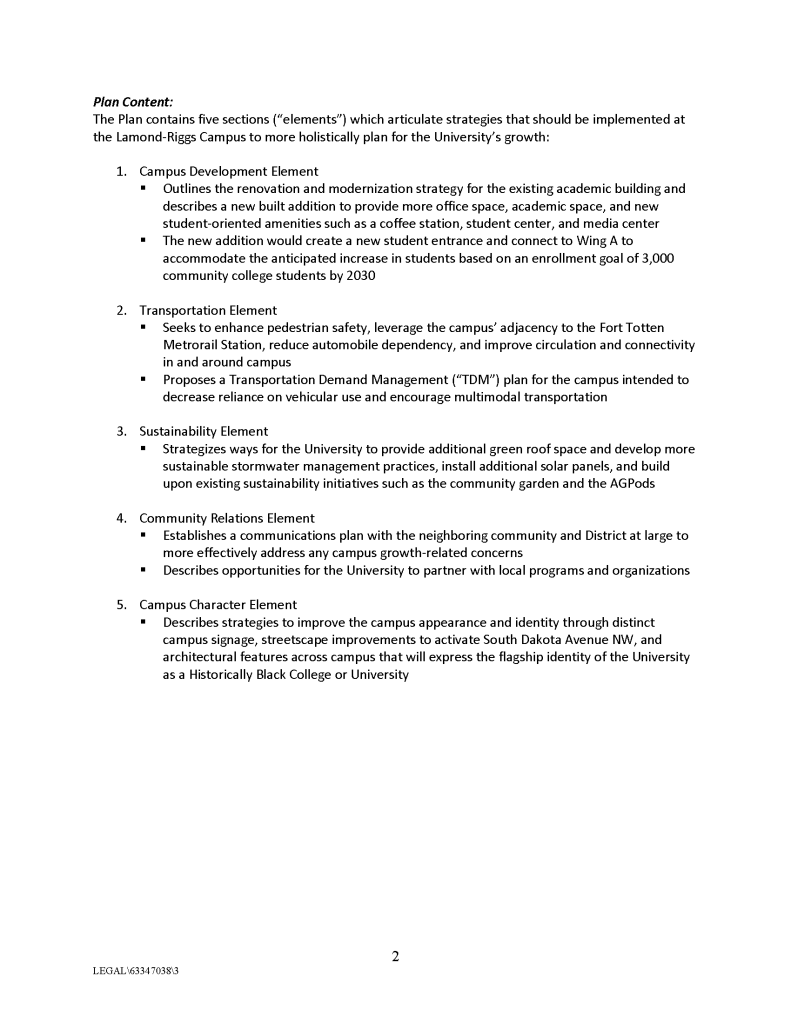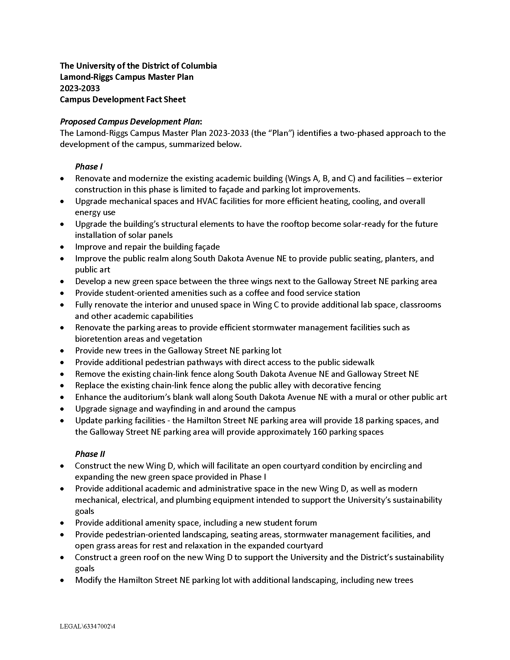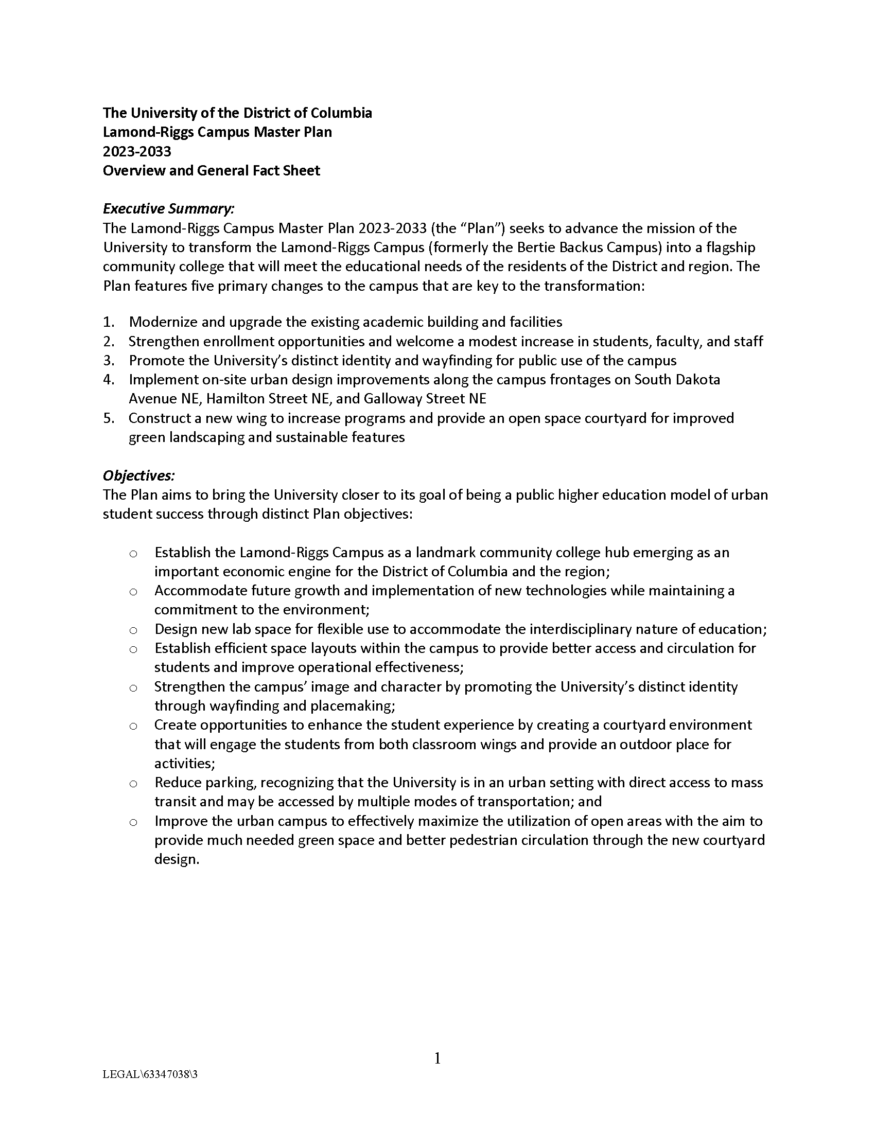 On June 21, 2023, UDC submitted a campus plan application to the DC Zoning Commission for the Lamond-Riggs campus (ZC case no. 23-16). The Lamond-Riggs campus (formerly known as the Bertie Backus campus) houses the university’s community college programs. DC zoning regulations require universities to update campus plans every 10 years. This proposed 2023-2033 campus plan is the first for the Lamond-Riggs campus. UDC plans to attend ANC 5A’s September 2023 meeting to seek a resolution in support of the plan ahead of an anticipated October 2023 zoning hearing.
