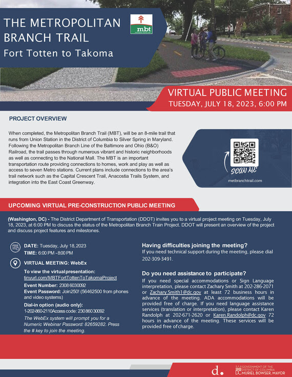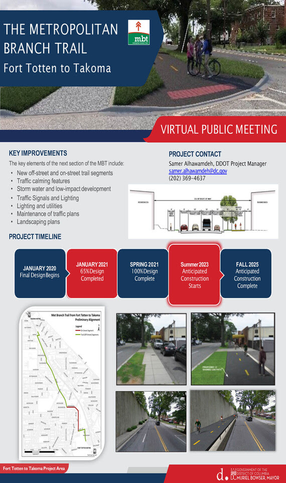 Public Meeting Notice: The Metropolitan Branch Trail Fort Totten to Takoma The District Department of Transportation (DDOT) invites you to a virtual project meeting on Tuesday, July 18, 2023, at 6:00 PM to discuss the status of the Metropolitan Branch Train Project. DDOT will present an overview of the project and discuss project features and milestones.