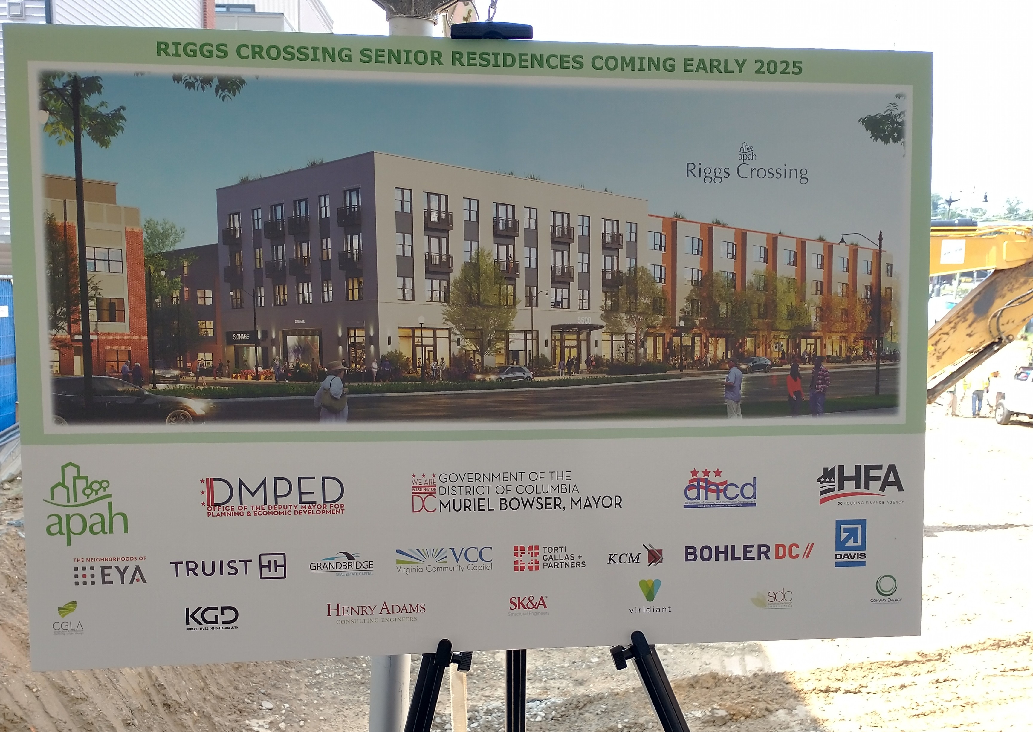 Mayor Muriel Bowser joined residents to break ground on construction of Riggs Crossing, a senior resident building that will be located on the southeast corner of South Dakota Avenue and Riggs Road NE. The lead developer is the Arlington Partnership for Affordable Housing (APAH) in partnership with EYA.
