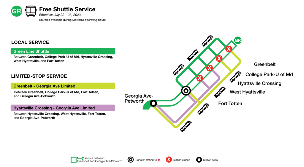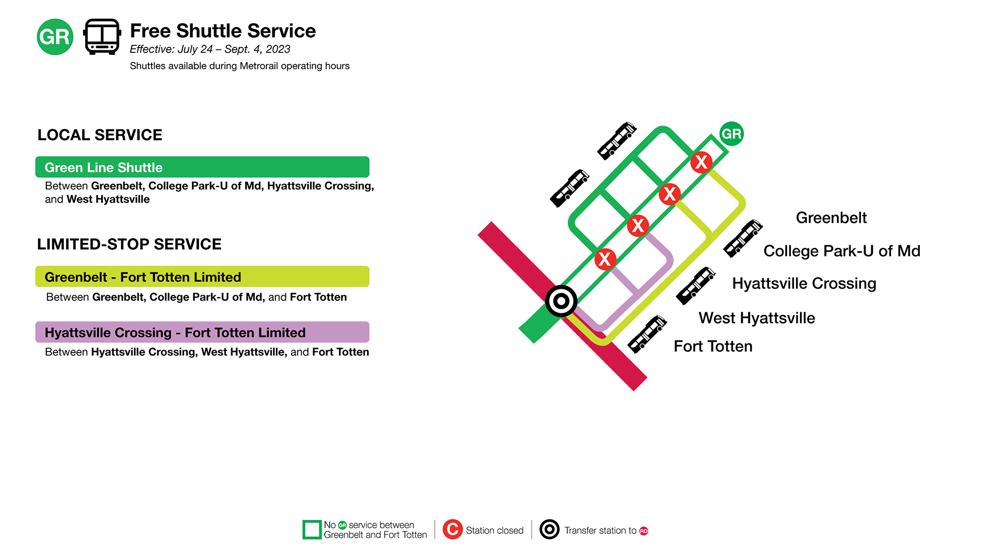 Green Line Shuttle: Local service every 10 minutes between Greenbelt, College Park-U of Md, Hyattsville Crossing, and West Hyattsville.