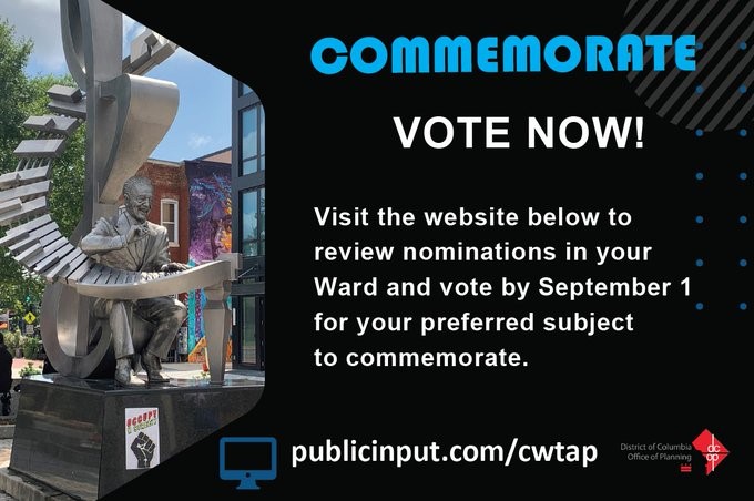 Residents of Wards 4, 5, and 7 are invited to vote on the subject for a future commemorative work from now until Friday, September 1. The DC Office of Planning previously accepted nominations for commemorative works subjects and has now prepared information on each as well as a dedicated website for each ward to vote on. The selected subject will be the focus of artists and consultants hired by the Office of Planning to prepare a concept design of a work, with additional community feedback and updates informing the final design.