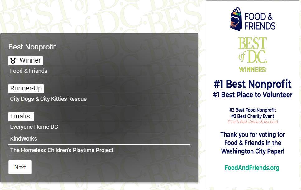 Congratulations to Food & Friends! The neighobrhood organization was voted “Best nonprofit” and “Best place to volunteer” in Washington City Paper’s Best of DC 2023 people’s poll. The organization is located at 219 Riggs Road NE. Check out the website and volunteer opportunities at https://foodandfriends.org.