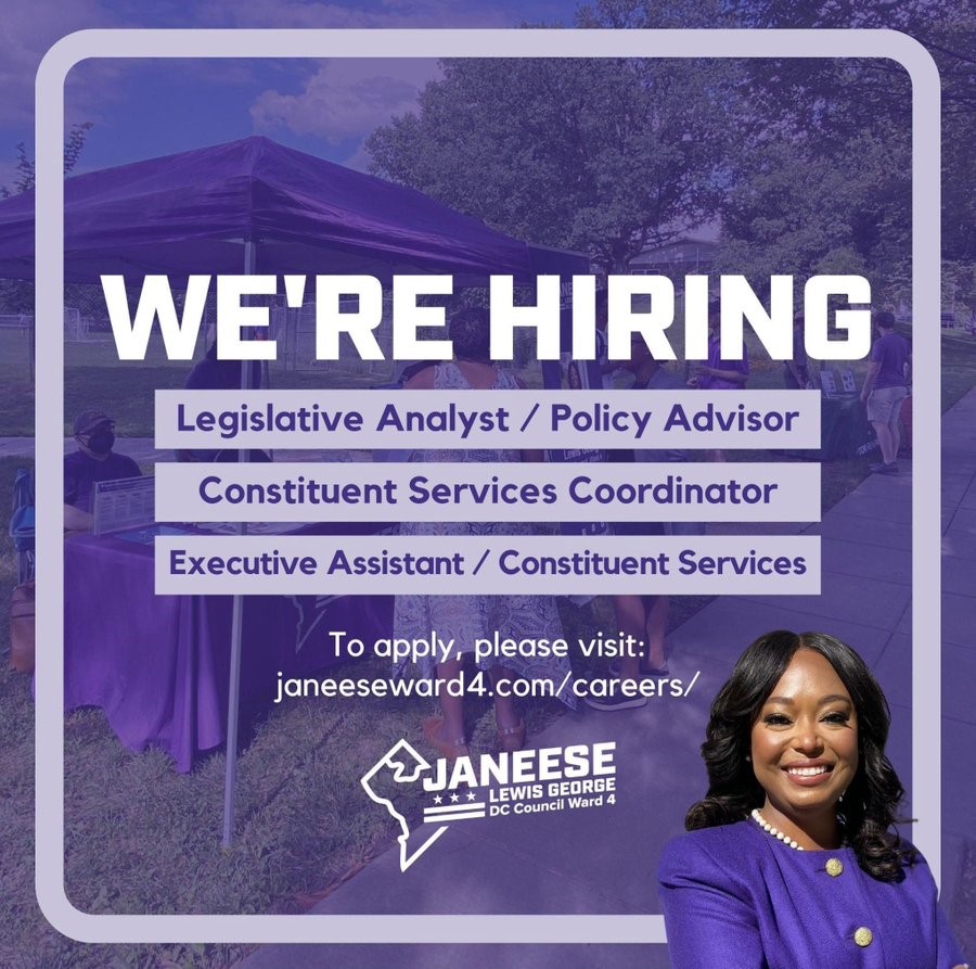 Click on each position for the full job posting, a description of the position, and instructions on how to apply. You can also find the postings under the DC Council’s list of job openings. If you have any questions about the openings, please email Chief of Staff, Kelly Hunt, at khunt@dccouncil.gov.