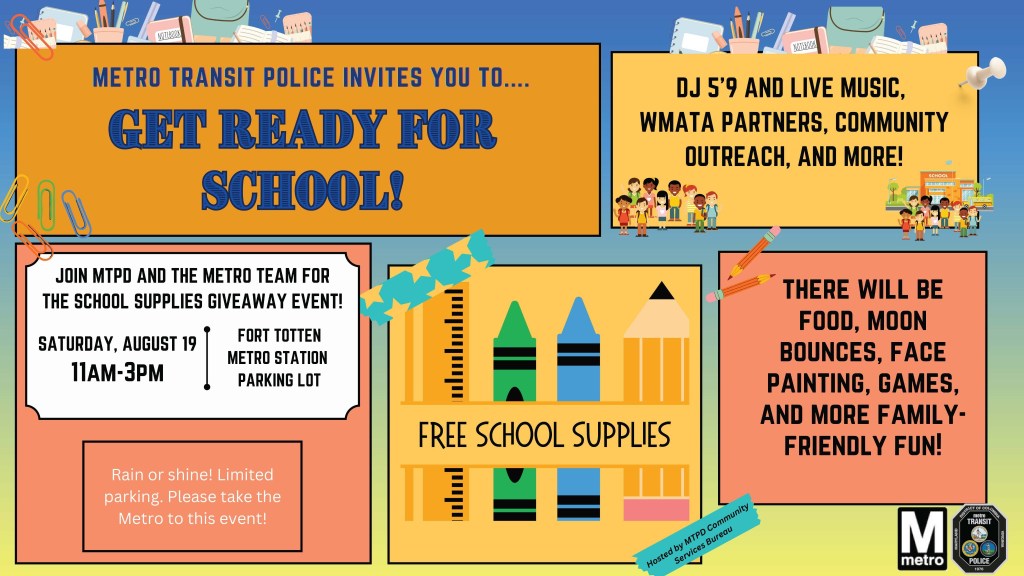 Free backpacks & school supplies. Hosted by Metro Transit Police Community Services Bureau. Children of all ages are welcome from elementary to high school. There will be family-friendly activities, including a moon bounce, miniature train rides, a live DJ and band, and free food.