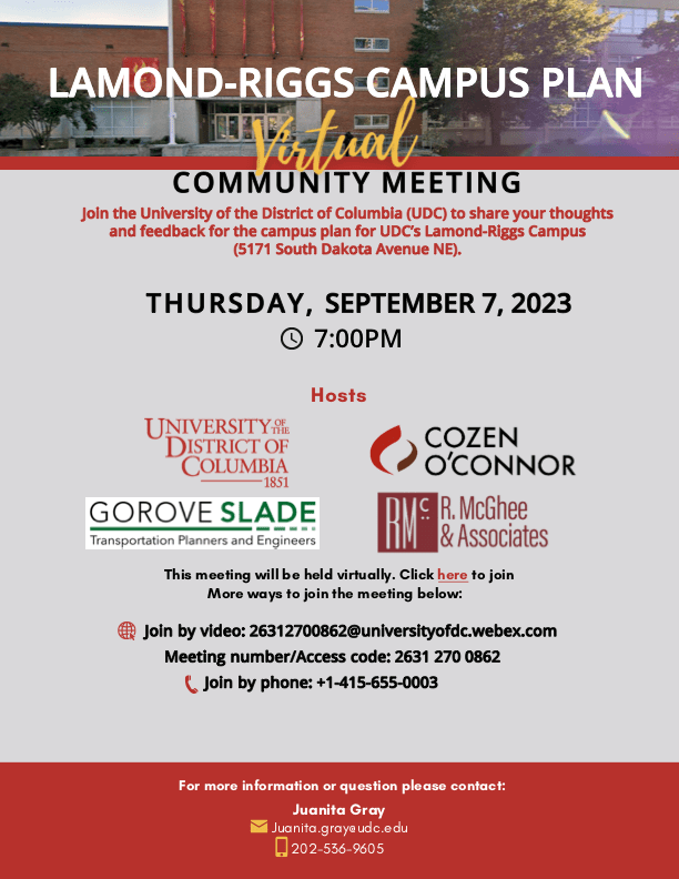 UDC will hold a virtual community meeting on the proposed Lamond-Riggs Campus Plan on September 7, 2023 at 7:00 pm. Please join this meeting to share your thoughts.