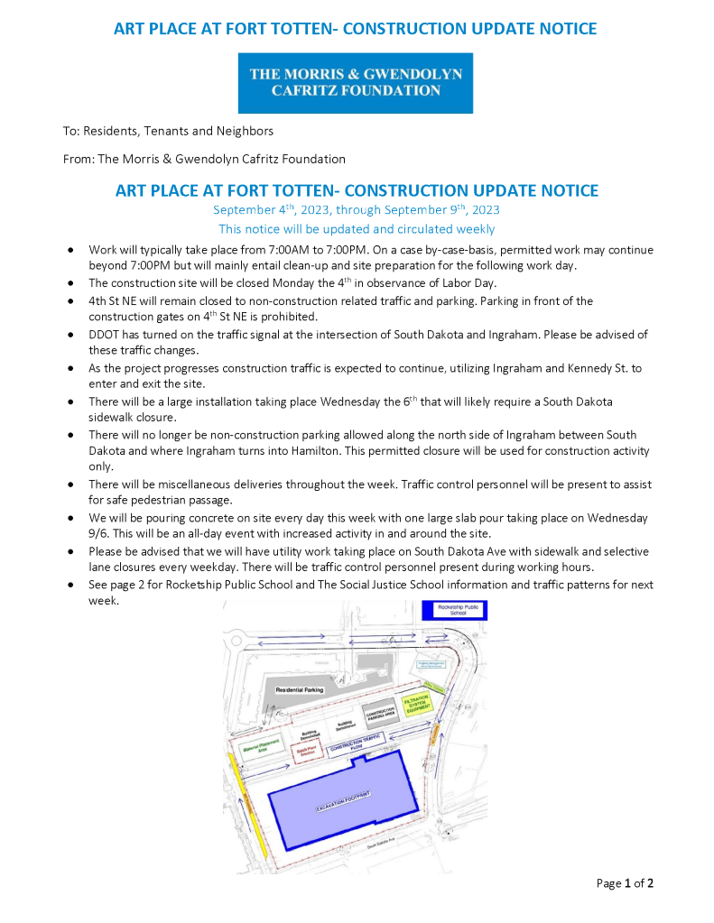 Art Place Construction Notice 9/4/2023-9/9/2023 Posted by nextstoprp in Cafritz Art Place at Fort Totten September 4, 2023 Art Place Construction Notice 9/4/2023 Share this: Click to share on X (Opens in new window) X Click to share on Facebook (Opens in new window) Facebook Click to share on X (Opens in new window) X Click to email a link to a friend (Opens in new window) Email Click to print (Opens in new window) Print Like Loading... Related