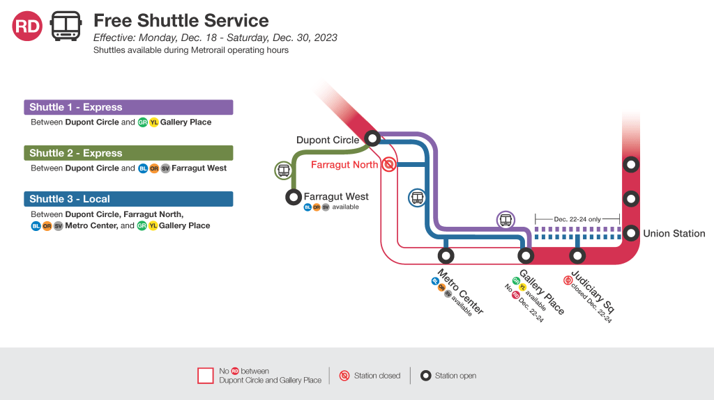 Reminder, Metro will be doing construction on a portion of the red line December 18-30, 2023. Red line trains will be running every 10-12 minutes. Details on station closures, transit options, shuttle bus information, FAQs at https://wmata.com/initiatives/plans/red-line-construction/index.cfm.