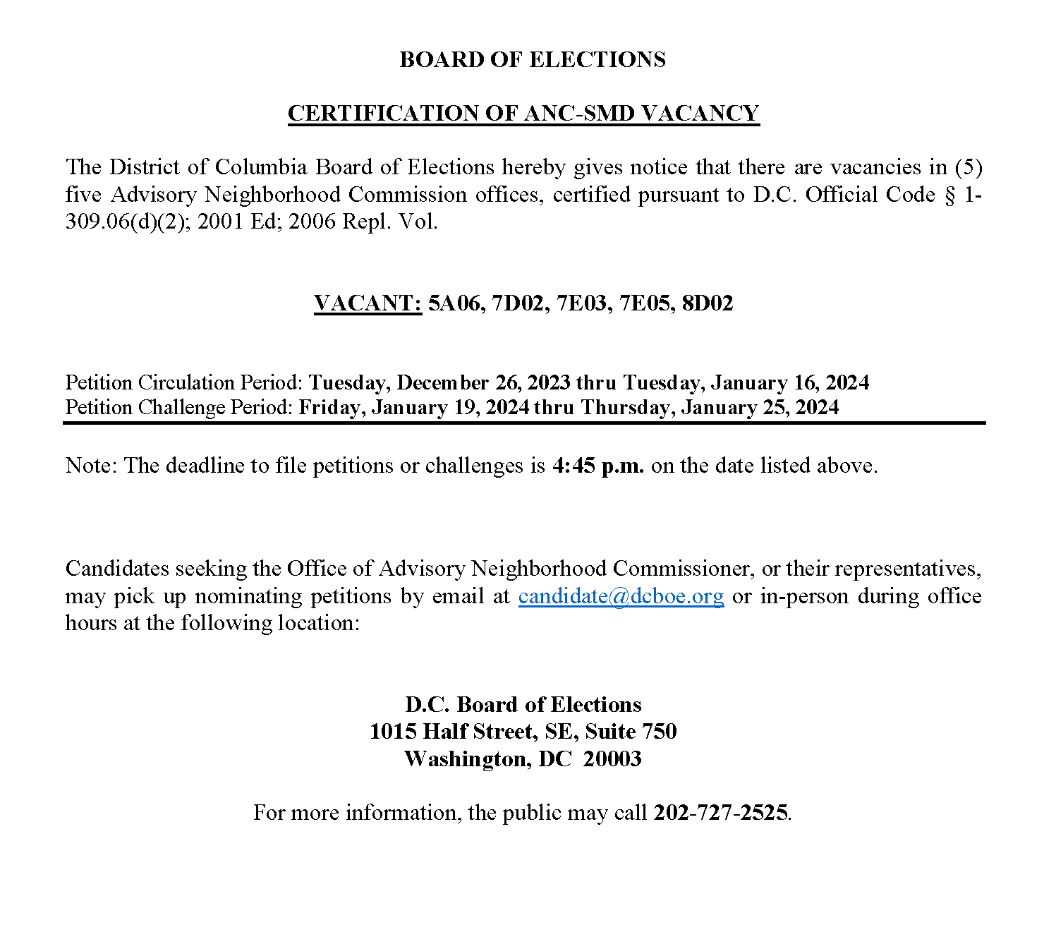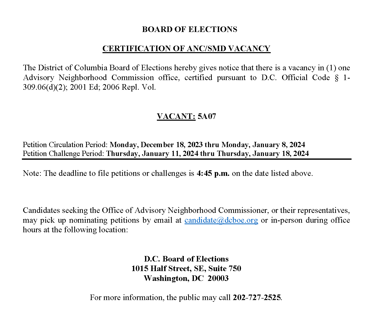 There are now two vacancies on ANC 5A. The DC Board of Elections recertified a vacancy for ANC 5A07. Petitions for 5A07 will be available starting December 18, 2023, and will be due no later than January 8, 2024.