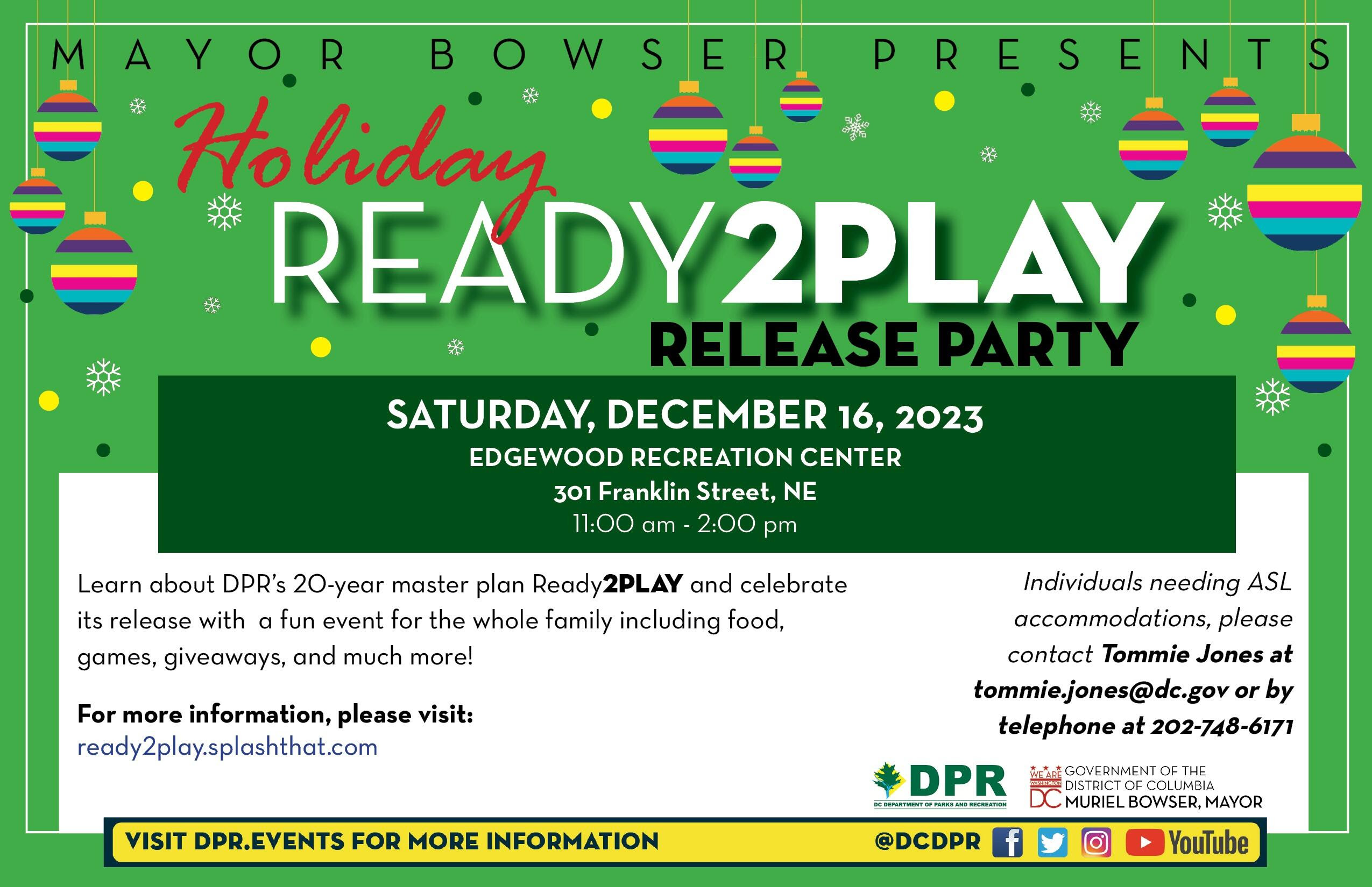 Ready2Play Release Party December 16, 2023 11:00 am-2:00 pm Edgewood Recreation Center 301 Franklin Street NE
