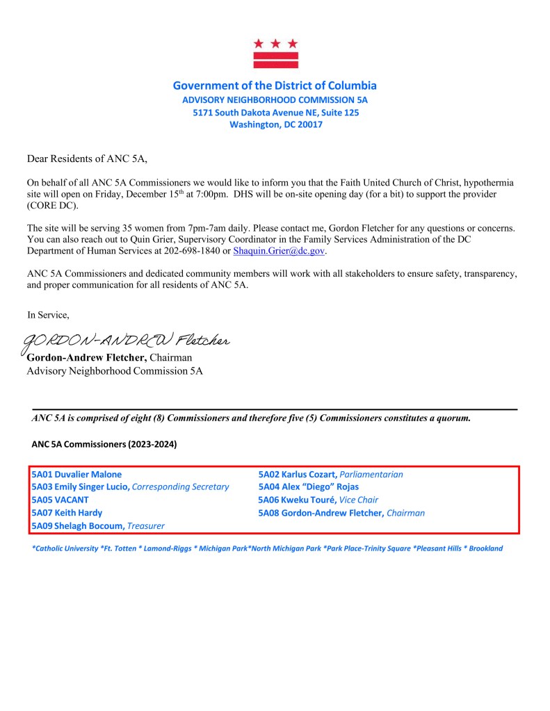 According to a notice sent by ANC 5A yesterday, the hypothermia site at Faith United Church of Christ opened on December 15, 2023. The church is located at 4900 10th Street NE. The site will serve up to 35 women from 7 pm to 7 am during hypothermia season. For questions/concerns, contact ANC Commissioner Gordon Fletcher (5A08) or contact Quin Grier, Supervisory Coordinator in the Family Services Administration of the DC Department of Human Services, at shaquin.grier@dc.gov.