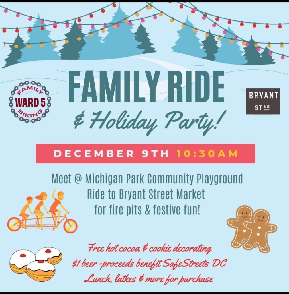 Join Ward 5 Family Biking for a holiday bike ride & party. Ride from Michigan Park Community Playground to Bryant Street Market. Enjoy free hot cocoa & cookie decorating. Lunch, latkes, and drinks for purchase.