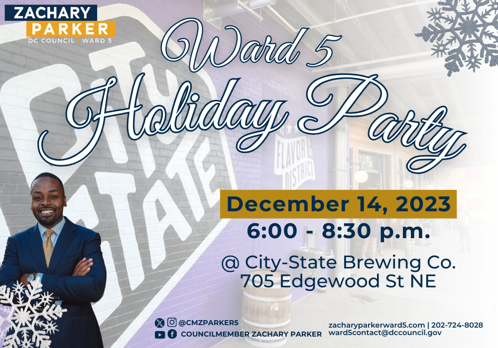 Join Ward 5 Councilmember Zachary Parker on December 14 from 6:00 – 8:30 p.m. at City-State Brewing Co. (705 Edgewood St NE) for a night of food, music, dancing, and celebration together as a community. Please bring a new, unwrapped toy or coat for our toy and coat drive. Please RSVP here!