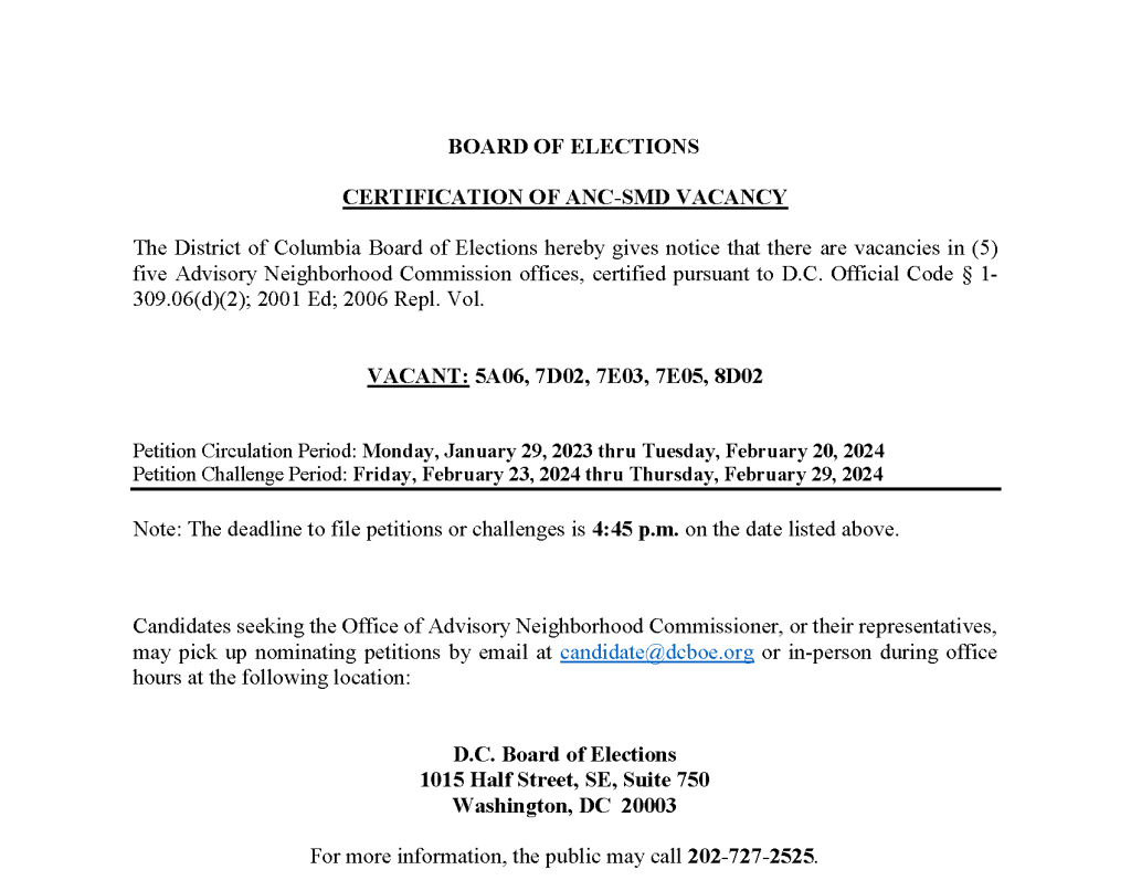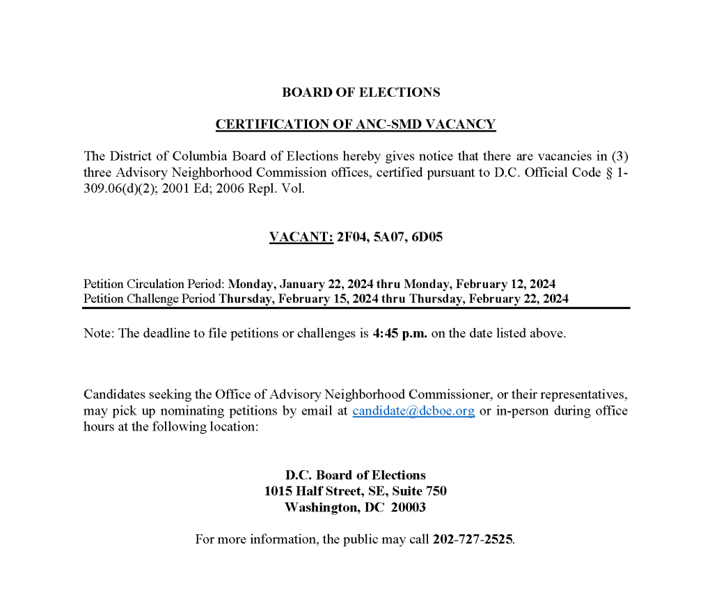 There is still a vacancy in ANC single member district 5A06. Petitions are available starting today, January 29, and are due on February 20, 2024.