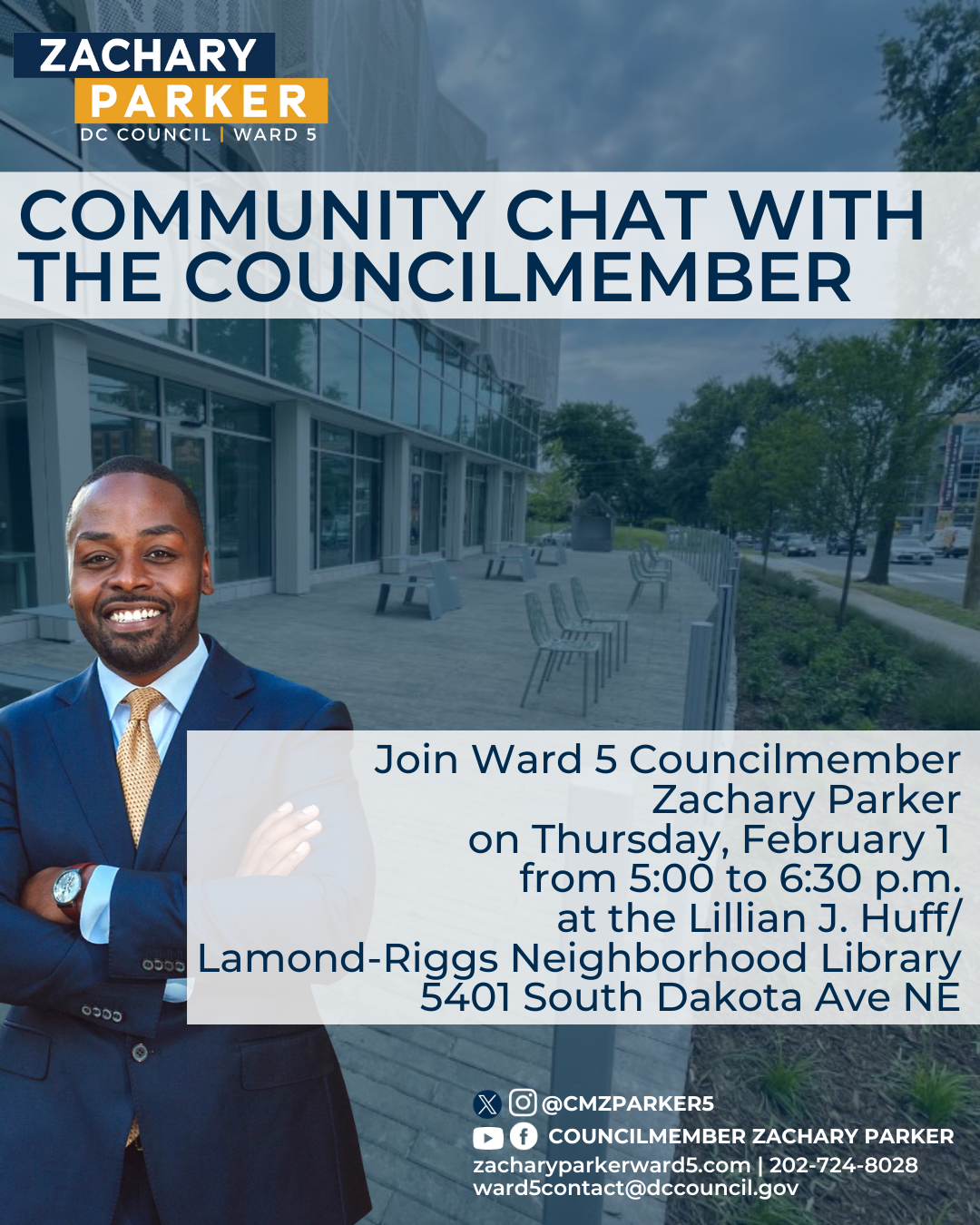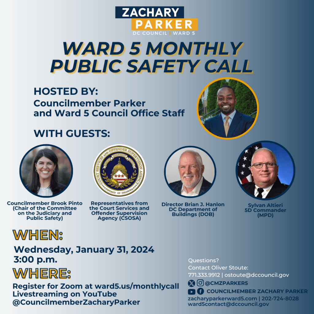 Ward 5 Councilmember Zachary Parker invites residents to join his next Monthly Public Safety Call on Wednesday, January 31, 2024, at 3:00 p.m.
