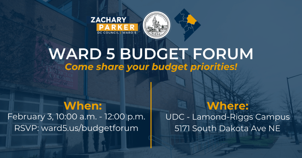 As a reminder, Councilmember Parker will be holding a Ward 5 budget forum on February 3, 2024, at UDC Lamond-Riggs Campus. Register to attend the budget forum at ward5.us/budgetforum.