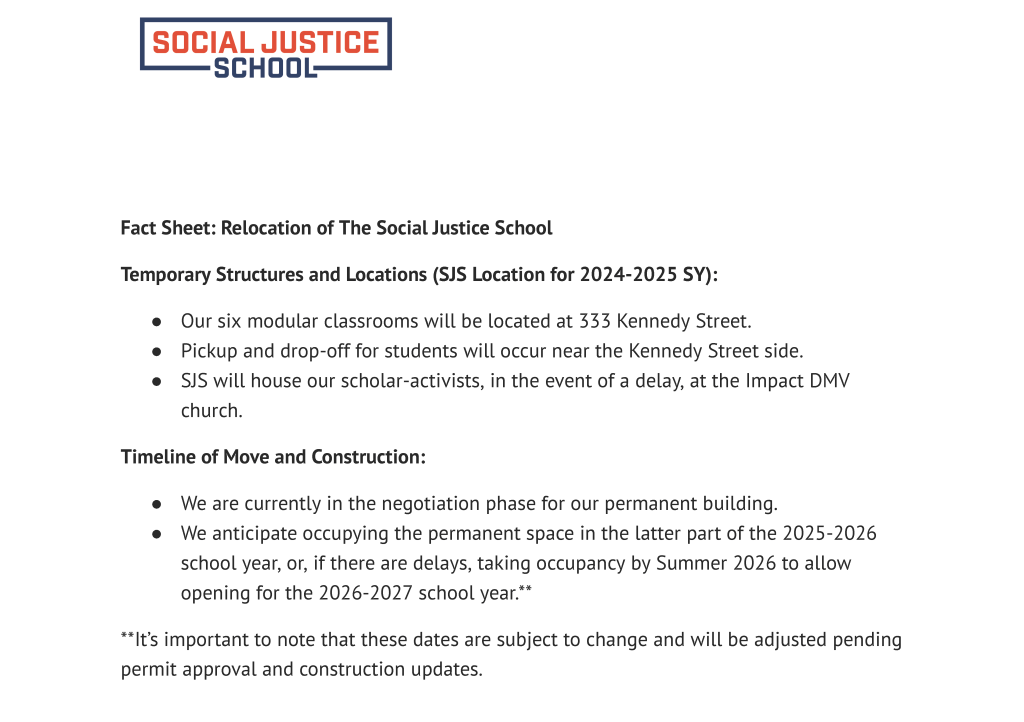 Back in June, the DC Public Charter School Board approved Social Justice School’s relocation application (see this post for information about the relocation). The plan remains having modular classrooms in place at 333 Kennedy Street NE for the beginning of the 2024-2025 school year. If there is a delay, classes will be held temporarily at Impact DMV Church on First Place NE.