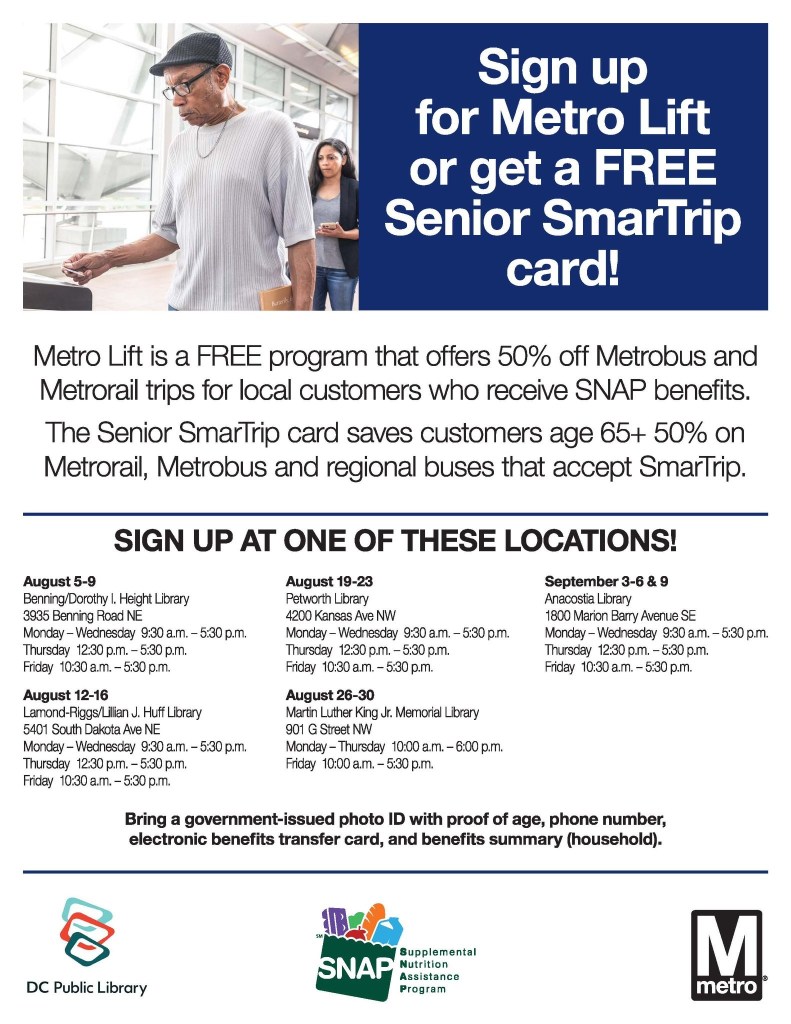 Metro and DC Public Library are partnering to offer Metro Lift and Senior SmarTrip card registration at select library locations. Eligible residents save 50% on bus and rail fares.