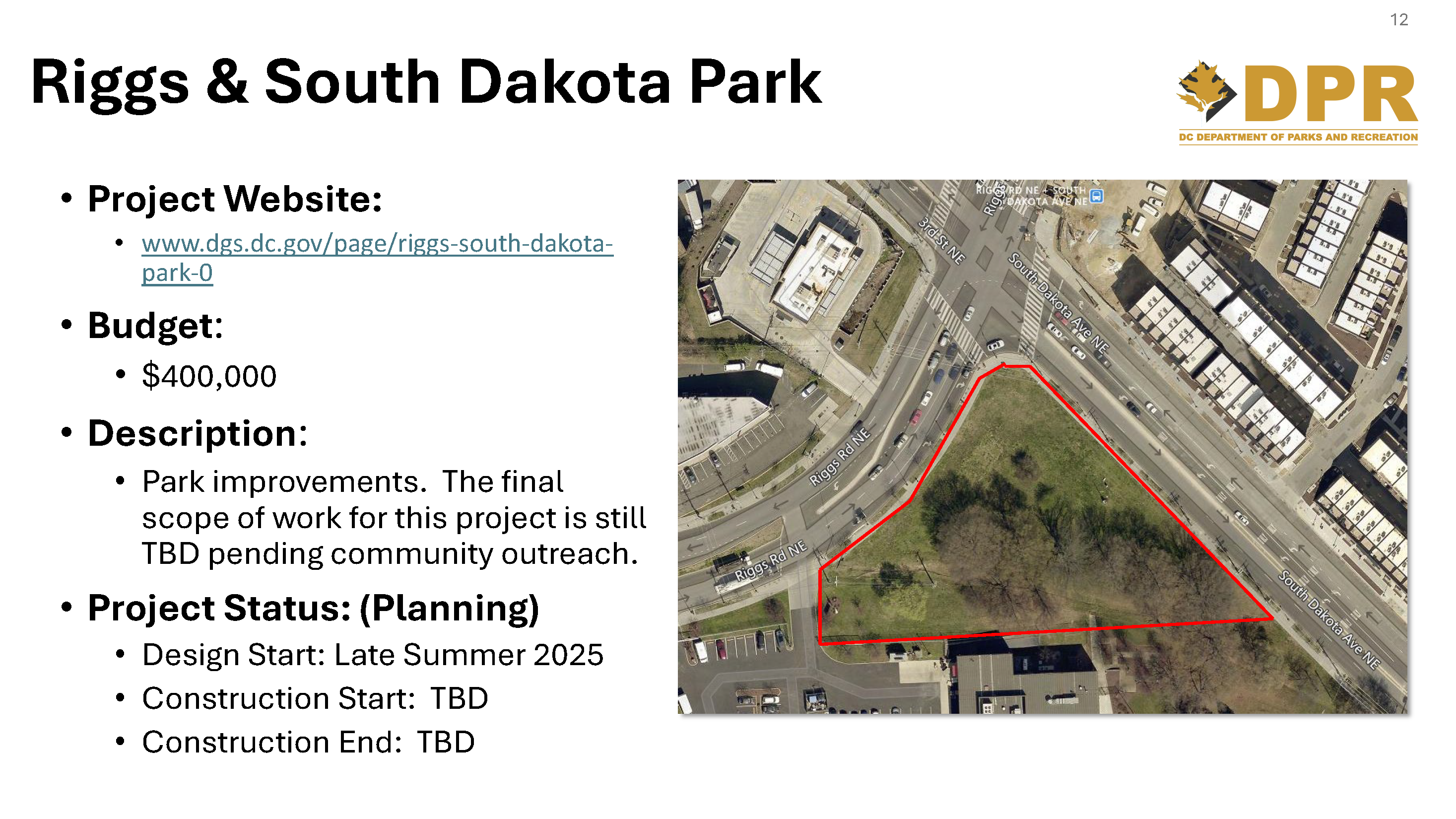 The DC Department of Parks & Recreation (DPR) gave an update on plans for a neighborhood park on the southwest corner of South Dakota Avenue and Riggs Road NE.
