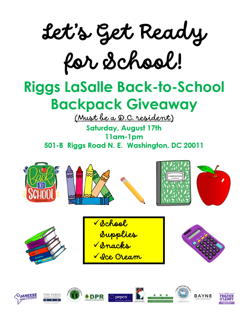 Free backpacks, school supplies, snacks & ice cream. Hosted by Friends of Riggs-LaSalle Recreation, Lamond-Riggs Citizens Association, and the Office of Ward 4 Councilmember Janeese Lewis George.