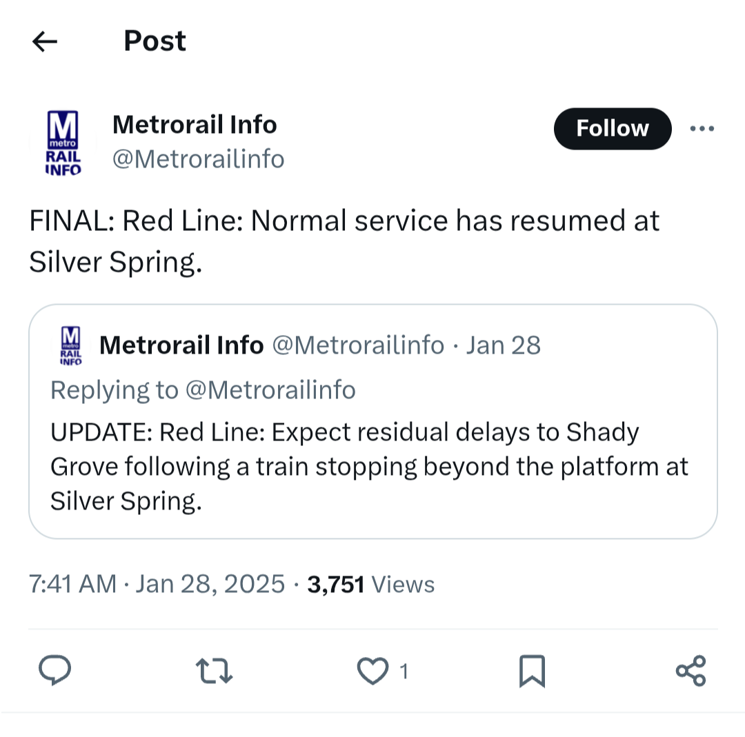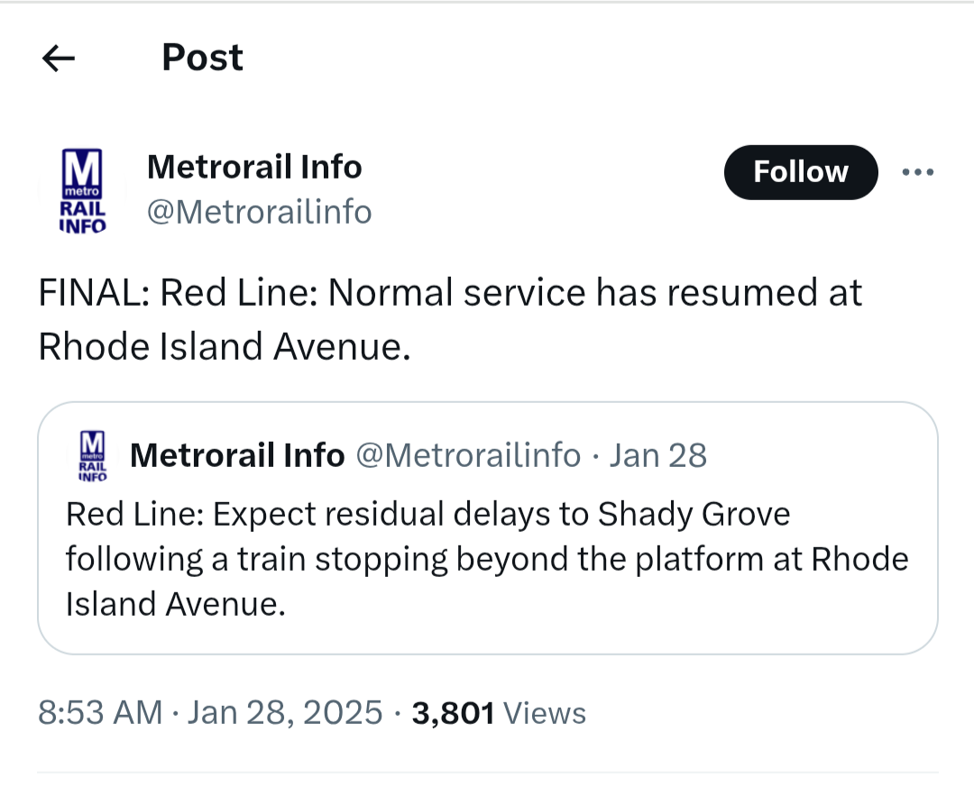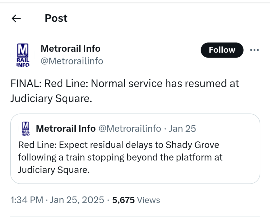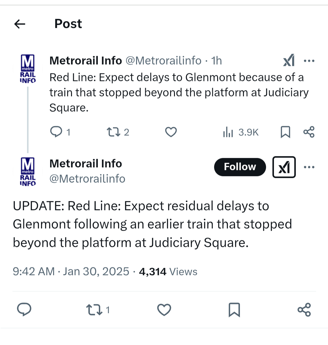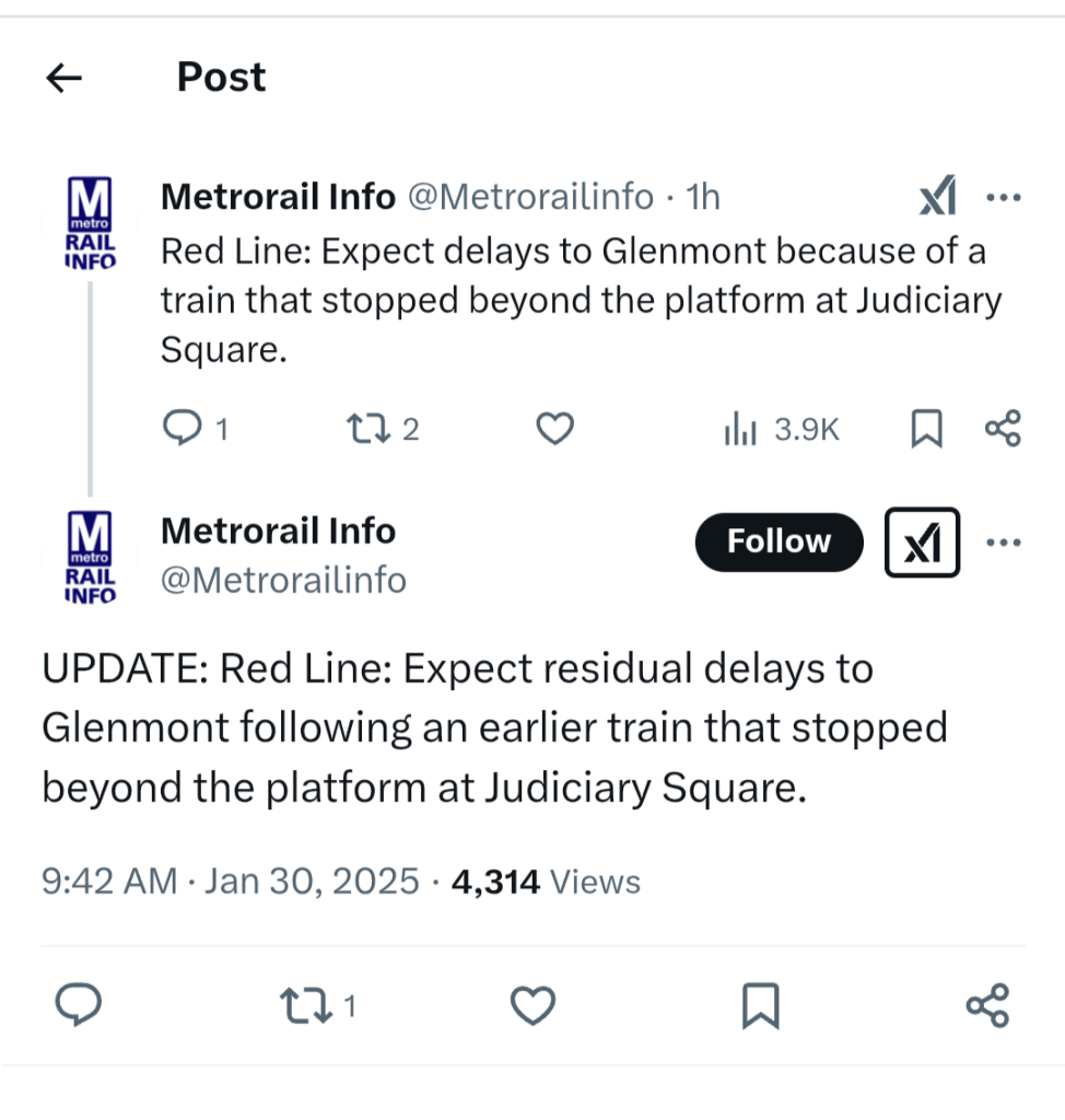 Also, Metro seems to have a problem with red line trains overshooting the platform lately. When trains stop beyond the platform, trains end up getting delayed up and down the line. This has happened seemingly three days in a row now, and I saw it happen by a long shot while waiting for a train at Judiciary Square a couple of weeks ago. Metro is running a lot of six-car trains during rush hour for reasons and when there are delays, the trains get dangerously crowded. Rush hour service on the red line has been pretty bad every day this week.
