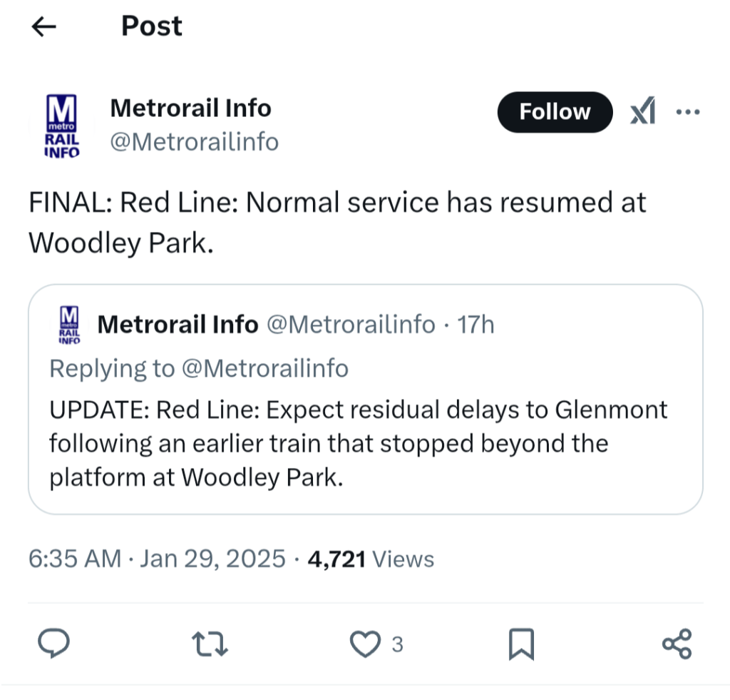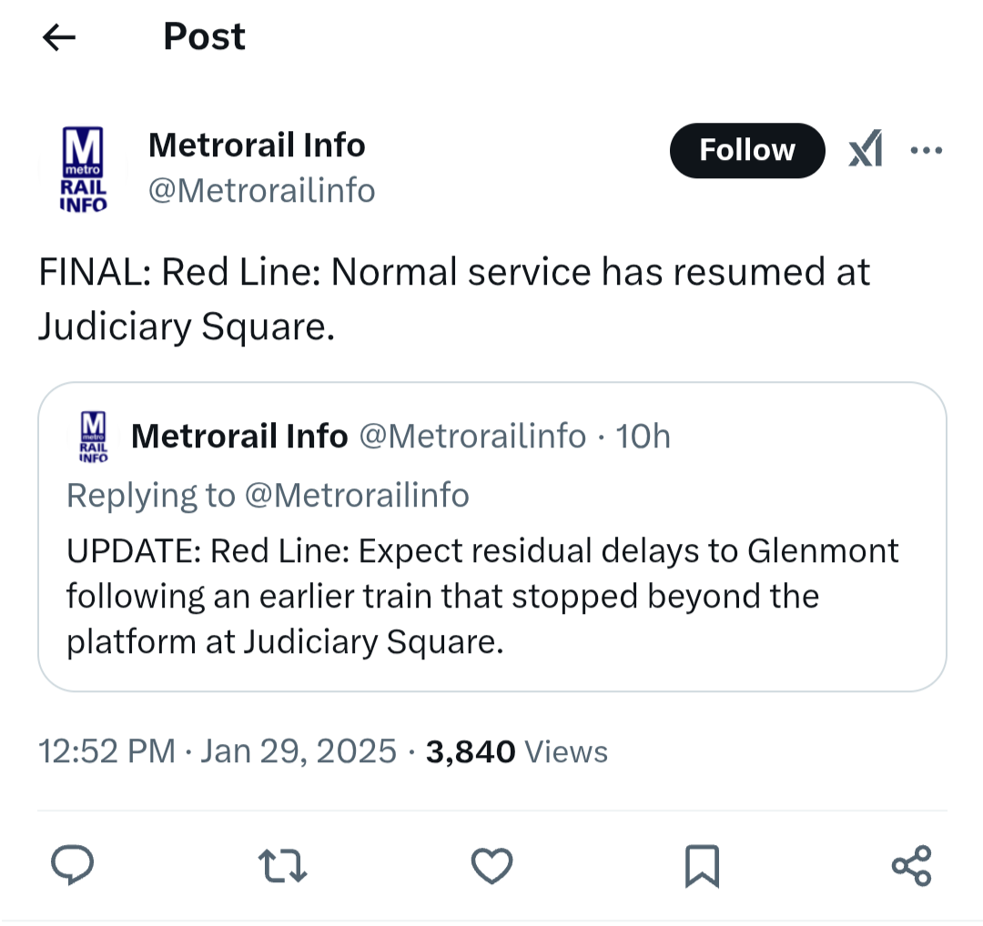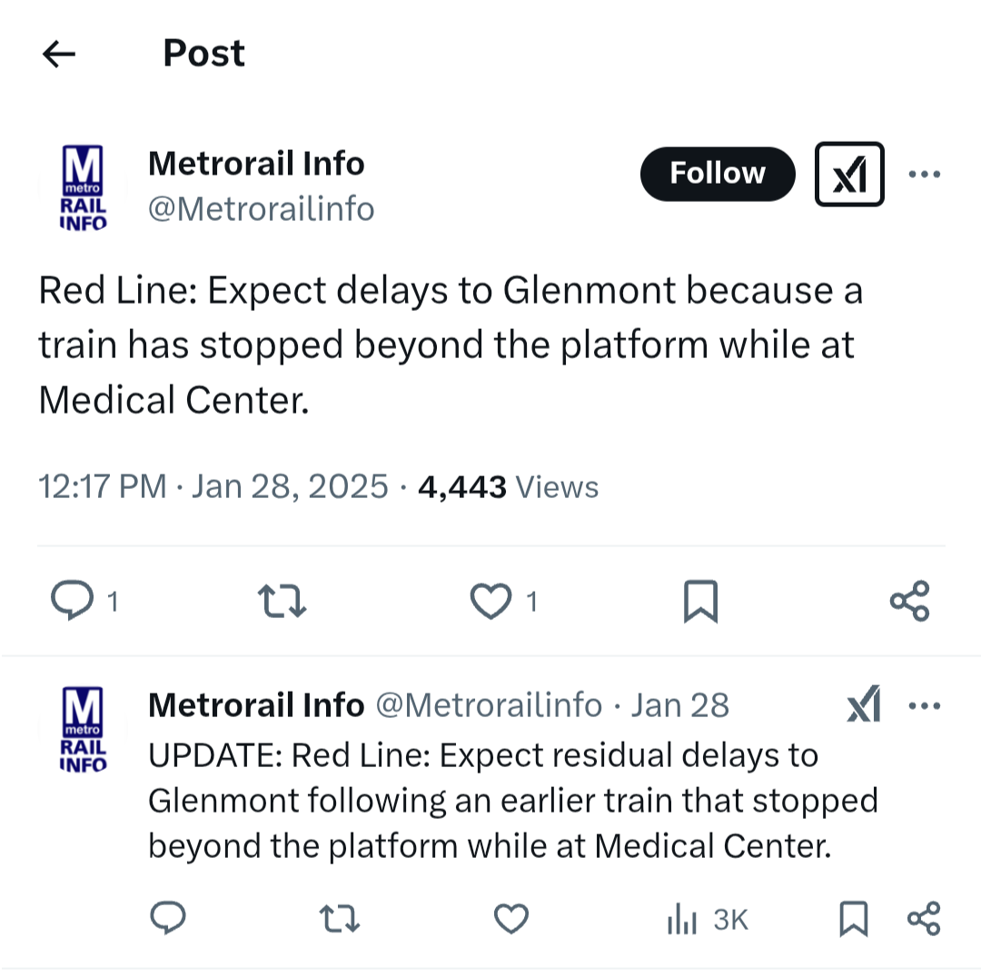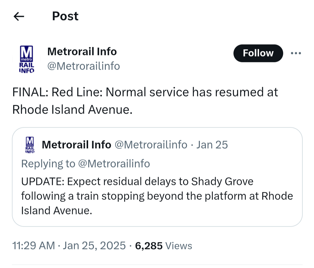 Also, Metro seems to have a problem with red line trains overshooting the platform lately. When trains stop beyond the platform, trains end up getting delayed up and down the line. This has happened seemingly three days in a row now, and I saw it happen by a long shot while waiting for a train at Judiciary Square a couple of weeks ago. Metro is running a lot of six-car trains during rush hour for reasons and when there are delays, the trains get dangerously crowded. Rush hour service on the red line has been pretty bad every day this week.