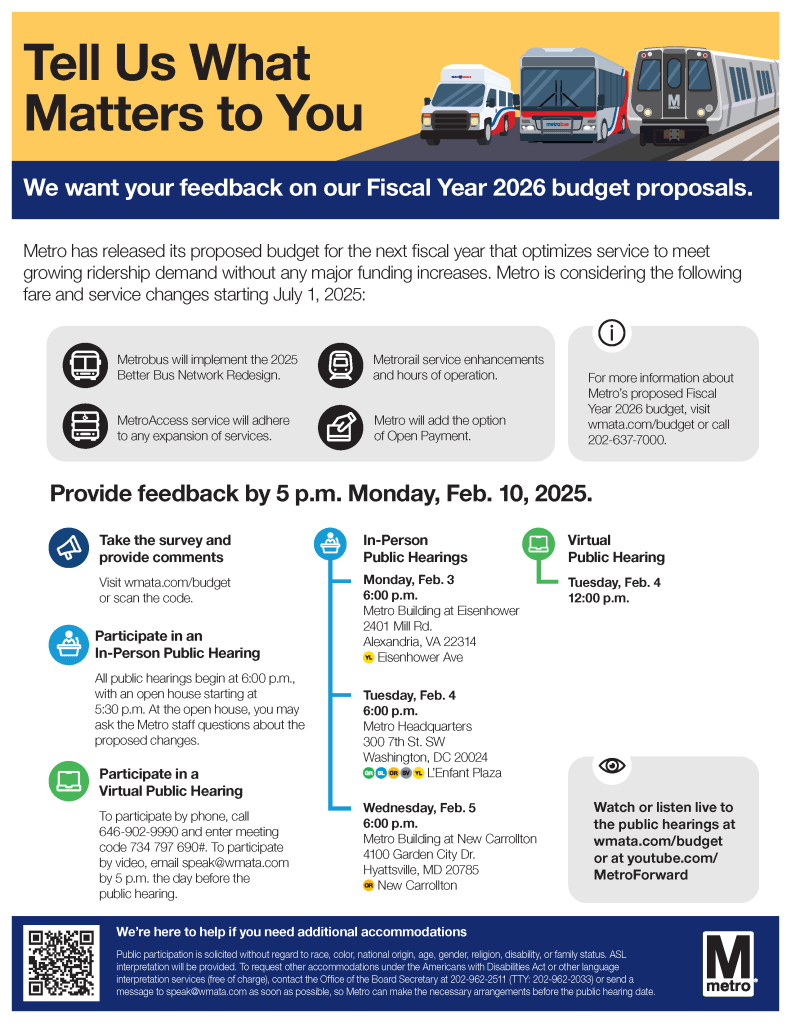 Metro is seeking input on its proposed Fiscal Year 2026 budget. For details and to submit comments/complete the public survey, visit wmata.com/budget. Provide feedback by 5:00 pm on February 10, 2025.