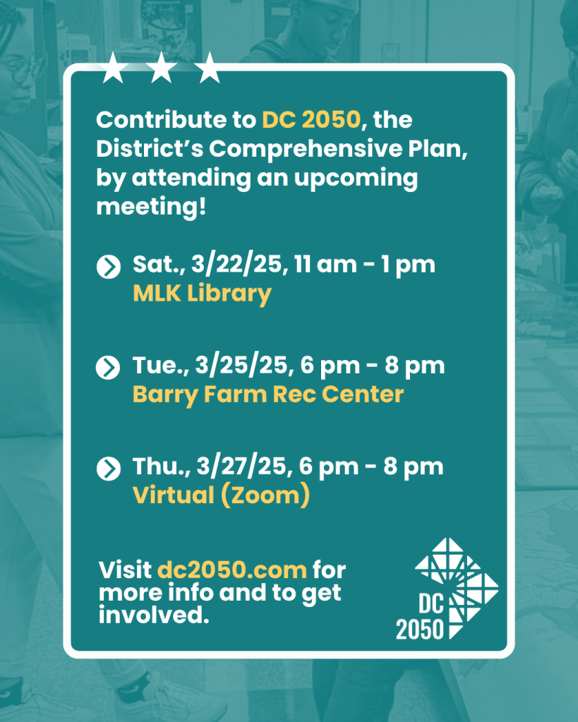 DC’s Office of Planning (OP) is holding three intro sessions for DC 2050, DC’s next comprehensive plan that will guide the city’s growth and development across all 8 wards.