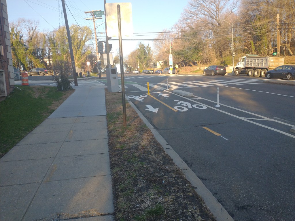 It seems like drivers are getting used to it. A couple of ancillary effects of the new cycletrack are that drivers can no longer use the dedicated right-turn lane from Riggs onto 1st Place NE to drive straight ahead to South Dakota as they used to do. They can no longer change lanes in the middle of the intersection like they used to do. And just from my initial observation, it seems like there is a little less speeding down the slight hill towards South Dakota. People realize they need to drive a bit more carefully through this area.