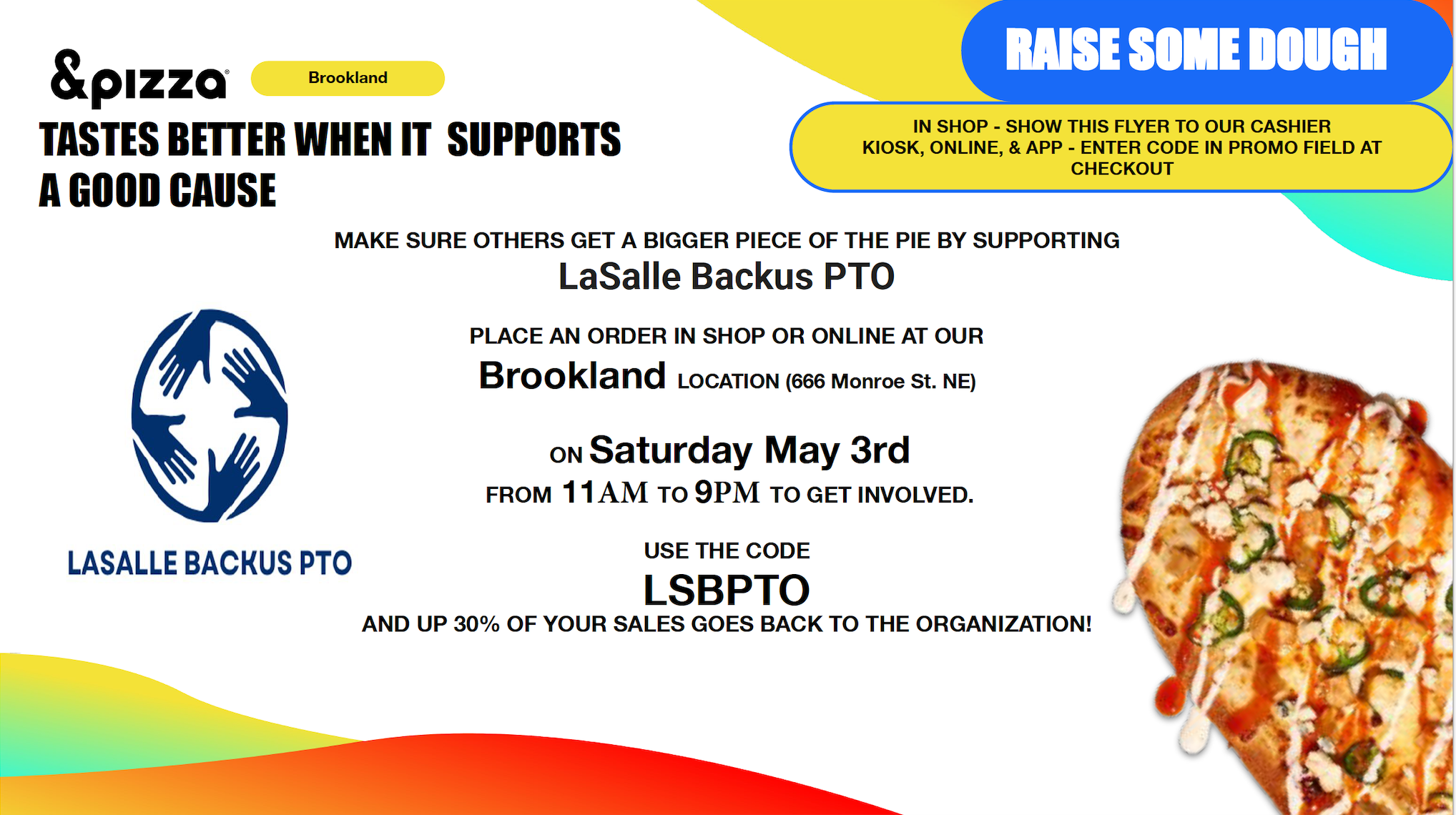 Eat out at &pizza and support a good cause! Place an order in the shop (show flyer) or order online and use code LSBPTO. Up to 30 percent of sales goes to support our neighborhood public school, LaSalle-Backus Elementary.