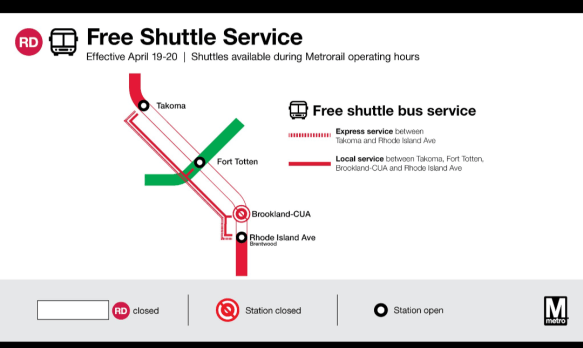 | Red Line | Free shuttle buses replace trains between Rhode Island Ave and Takoma stations. Brookland-CUA and Fort Totten (Red Line platform) closed. Trains run every 6 minutes (daytime) and 10 minutes (evening) between Shady Grove and Rhode Island Ave and between Takoma and Glenmont. |
