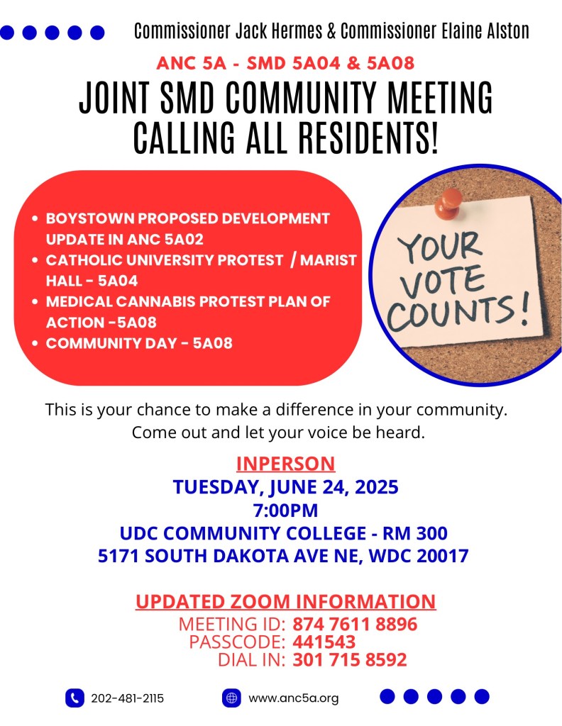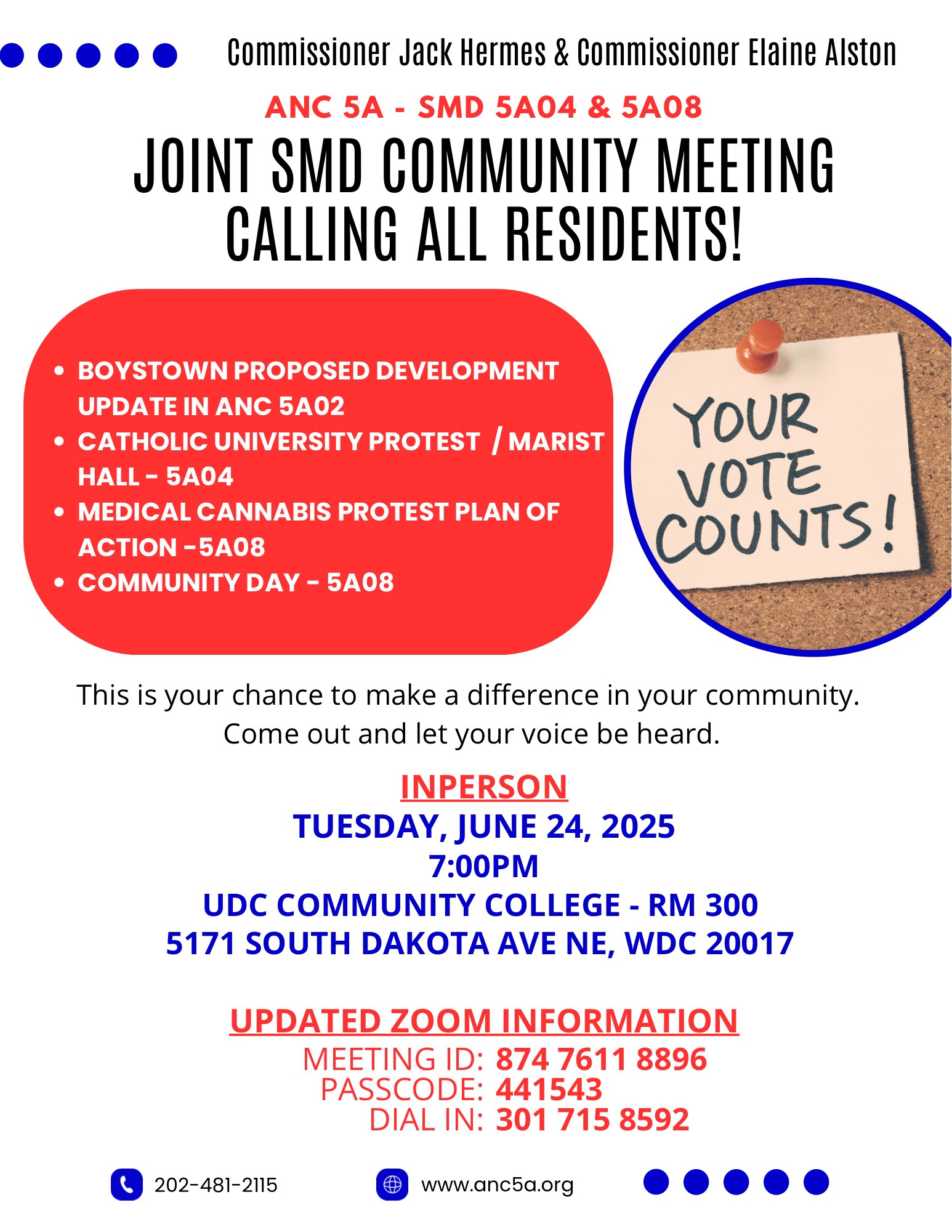 ANC 5A will have Urban Atlantic at the next public meeting on June 25, 2025, to discuss the Boys Town redevelopment project. The property sits at 4801 Sargent Road NE in ANC 5A02.
