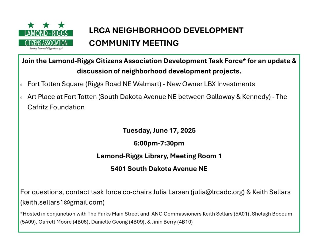 Join ANC 4B & 5A Commissioners,* the Lamond-Riggs Citizens Association, and The Parks Main Street for a clean up day and park concept plan review on June 28, 2025!